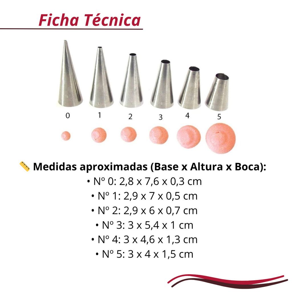 Bico para confeitar em inox. Indicado para decoracao de bolos, tortas, cupcakes, etc. Bico Grande, com emenda. Medidas aproximadas (base x altura x boca) no0 - 2,8 x 7,6 x 0,3 cm no1 - 2,9 x 7 x 0,5 cm no2 - 2,9 x 6 x 0,7 cm no3 - 3 x 5,4 x 1 cm no4 - 3 x 4,6 x 1,3 cm no5 - 3 x 4 x 1,5 cm Nao encontrou o que procura? Nos envie uma mensagem com sua sugestao! Faremos o possivel para encontrar e publicar o que deseja com um valor competitivo, assim voce podera colocar todos os produtos no carrinho e enviaremos tudo em um unico frete. A ISAMAR e uma empresa voltada ao segmento de panificacao e confeitaria. Atuamos no mercado desde 1978, criando parcerias e impulsionando negocios. Desenvolvemos produtos de alta qualidade para que possamos atender bem cada cliente, o que faz de cada um, parceiros e amigos. Atuamos em todo o territorio nacional oferecendo solucoes completas para o setor. OBRIGADO PELA VISITA E BOAS COMPRAS!