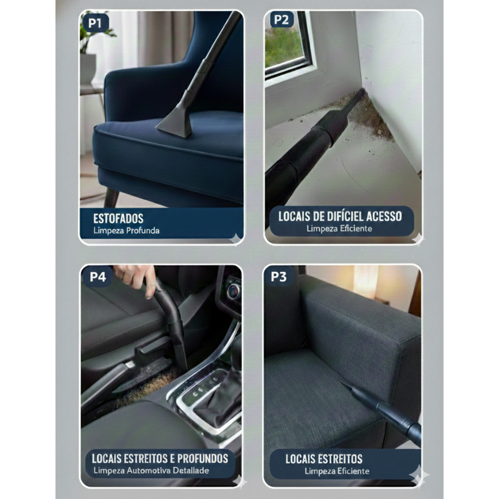 Kit Bicos para Aspirador Universal 4 Peças – Acessórios para Limpeza O Kit de Bicos para Aspirador Universal é ideal para quem busca uma limpeza mais eficiente, detalhada e prática no dia a dia. Compatível com todos os aspiradores que possuem a ponteira de 32 mm (padrão), esse conjunto de 4 bicos para aspirador facilita o acesso a cantos difíceis, frestas, estofados e superfícies delicadas. Perfeito para uso residencial ou automotivo, o kit oferece versatilidade, encaixe fácil e excelente desempenho na limpeza. Principais Benefícios ✔ Compatível com aspiradores universais ✔ Facilita a limpeza de cantos, frestas e áreas estreitas ✔ Ideal para sofá, carro, teclado, estofados e pisos ✔ Material resistente e durável ✔ Fácil de usar e trocar ✔ Organização prática com base inclusa Conteúdo do Kit 01 Bico de boca larga – 9 cm 01 Bico reto estreito – 14 cm 01 Bico tubular – 15 cm 01 Bico longo para áreas profundas – 20 cm Base organizadora com 21 cm Especificações Técnicas Tipo: Kit de bicos para aspirador Quantidade: 4 peças Compatibilidade: Universal Material: Plástico resistente Cor: Preto Uso indicado: Limpeza doméstica e automotiva