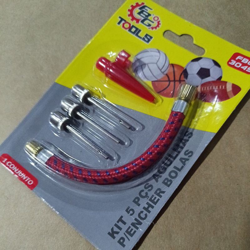 Kit Acessórios Bomba De Ar Bicos Encher Pneu Bolas 5 Peças Kit de bico e mangueira para encher bolas, infláveis e pneus de bicicletas. O kit é composto de: 03 - Bicos de Metal ideal para encher bolas. 01 - Bico de Plástico ideal para encher infláveis. 01 - Mangueira de 11cm com adaptador para os bicos nas duas pontas. Material : Aço cromado, PVC, borracha. Cuidados: Mantenha sempre longe do alcance de crianças.