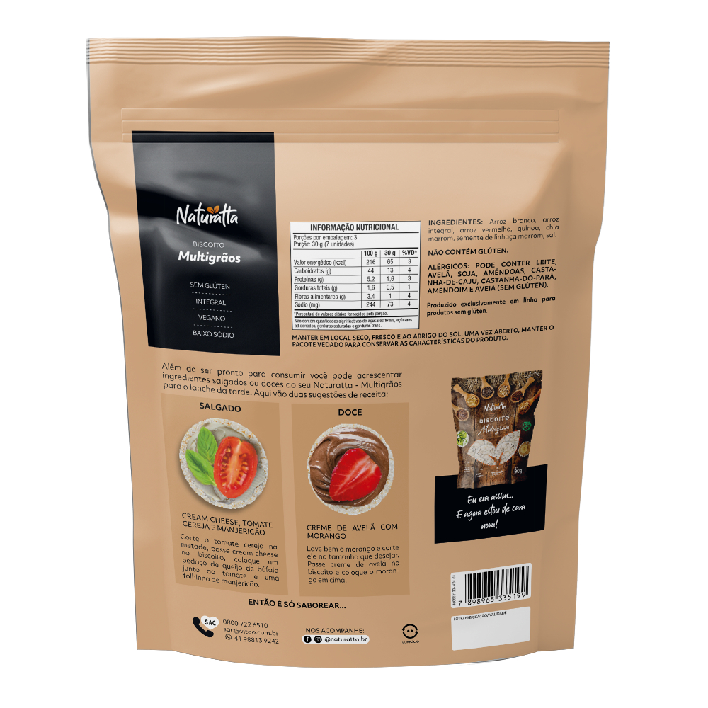 O biscoito de arroz multigrãos é uma opção saudável e versátil, perfeita para quem busca um lanche nutritivo e saboroso. Feito com uma mistura de grãos como arroz, quinoa, chia, linhaça e outros cereais, este biscoito oferece uma variedade de nutrientes essenciais para uma alimentação equilibrada. Com uma textura crocante e um sabor levemente terroso, o biscoito de arroz multigrãos é uma escolha versátil que pode ser desfrutada sozinha ou acompanhada de pastas, patês, queijos ou frutas. Por ser livre de glúten, é uma opção inclusiva para pessoas com restrições alimentares ou intolerância ao glúten. INGREDIENTES: Arroz branco, arroz integral, arroz vermelho, quinoa, chia marrom, semente de linhaça marrom, sal. ALÉRGICOS: PODE CONTER AVELÃ, SOJA, AMÊNDOA, CASTANHA-DE-CAJU, CASTANHA-DO-PARÁ, AMENDOIM E AVEIA (SEM GLÚTEN). NÃO CONTÉM GLÚTEN. SEM GLÚTEN, VEGANO, BAIXO EM SÓDIO.
