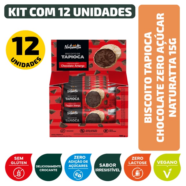 | Kit Biscoito Tapioca Chocolate Zero Açúcar Naturatta 15G - 12 Unidades este produto | R$ 50,66 | 6% | 4.9/5 | 40 |