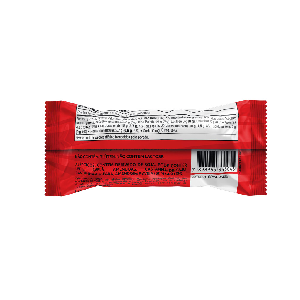 Experimente o delicioso Biscoito de Tapioca com Cobertura de Chocolate Amargo da Naturatta, uma opção irresistível e equilibrada para o seu lanche. Feito com ingredientes de alta qualidade, esse biscoito atende a diversas necessidades alimentares: Sem glúten: Ideal para celíacos e pessoas com sensibilidade ao glúten. Zero açúcar: Perfeito para quem quer reduzir a ingestão de açúcar. Sem Lactose: Uma escolha adequada para quem segue uma dieta restritiva, sem produtos de origem animal. Livre de conservantes: Fabricado sem conservantes artificiais, garantindo uma opção mais natural. Com uma cobertura de chocolate amargo, o biscoito de tapioca oferece uma combinação de sabores inigualáveis. O crocante do arroz integral se mistura ao sabor intenso e ligeiramente amargo do chocolate, criando uma experiência única e prazerosa. Uma excelente escolha para quem busca uma opção saudável e saborosa em qualquer momento do dia. INGREDIENTES: Sagu, arroz integral, gordura vegetal, cacau em pó, liquor de cacau, edulcorante maltitol, emulsificante lecitina de soja, estabilizante poliglicerol polirricinoleato e aromas. ALÉRGICOS: CONTÉM DERIVADO DE SOJA. PODE CONTER LEITE, AVELÃ, AMÊNDOAS, CASTANHA-DE-CAJU, CASTANHA-DO-PARÁ, AMENDOIM E AVEIA (SEM GLÚTEN). NÃO CONTÉM GLÚTEN. NÃO CONTÉM LACTOSE. SEM GLÚTEN, ZERO ADIÇÃO DE AÇÚCARES, ZERO LACTOSE, VEGANO, BAIXO EM SÓDIO.
