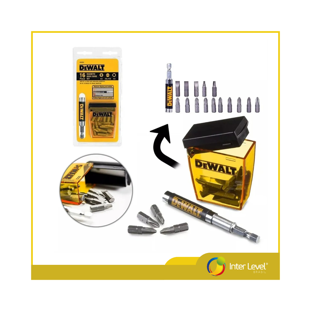 Seja bem-vindo a Inter Level Brasil. A Loja Online mais completa de ferramentas e acessórios. ***Kit de Bit 16 peças alongador magnético DW2053 DeWALT*** - Tipos de Pontas: Phillips, Fenda e Quadrada - Desenho exclusico para evitar deslizamento - Utilizado em Parafusadeiras - Menos danos, maior resistência e maior vida útil. - Especificações Técnicas: - Guia Magnética - 10 Peças Phillips #2 - 2 Peças Fenda #8 - 1 Peça Fenda #10 - 2 Peças Quadrada #2