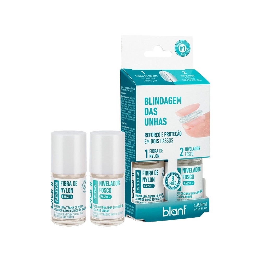 A unha é uma placa natural resistente e visível, que protege o dedo até a extremidade. Essa resistência natural da unha pode tornar-se frágil ao longo da vida, sendo mais vulnerável a vários elementos externos, como: Uso de unhas artificiais, produtos químicos de limpeza, impactos e outros, o que causa enfraquecimento, ressecamento e quebras. Kit Blindagem de unhas proporciona a formação de um escudo capaz de oferecer proteção e máxima resistência às unhas, o que permite um crescimento saudável e evita que elas sofram com qualquer imprevisto, através de 2 passos. *Indicado para reforço de proteção extra contra impactos, descamação e quebra em dois passos Contém:-Neonyca – aumenta produção de queratina e ceramidas nas unhas.-Acematt – agente fosqueante.-Microfibra de Nylon – promove resistência e flexibilidade nas unhas. Benefícios:-Formação de uma trama de micro fibra de nylon nas unhas;-Reforço físico para maior resistência das unhas;-Fortalece e promove uma proteção extra das unhas contra quebras, descamações e impactos. Dicas de uso:-Fibra de Nylon (1º PASSO): Aplique uma camada sobre toda a superfície da unha limpa e seca. Deixe secar por alguns minutos. As unhas ficarão ligeiramente ásperas, com uma trama de nylon visível.-Nivelador Fosco (2º PASSO): Aplique uma única camada e deixe secar completamente. Se a superfície da unha permanecer áspera, aplique uma segunda camada. Este produto irá deixar a superfície da unha totalmente lisa, permitindo assim a aplicação do esmalte.