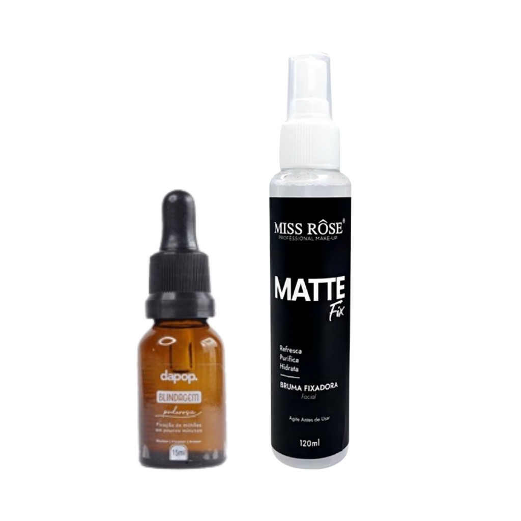 Kit Essencial de Maquiagem: Bruma Matte Fix da Miss Rôse & Blindagem Dapop Descubra o par perfeito para sua rotina de beleza com nosso Kit Essencial de Maquiagem, que inclui a Bruma Fixadora Matte Fix da Miss Rôse e a Blindagem Poderosa da Dapop. A Bruma Matte Fix, enriquecida com provitamina B5 e Sílica, não apenas acalma e hidrata a pele, mas também oferece um acabamento matte e aveludado. A Blindagem da Dapop, um produto tudo-em-um, atua como hidratante, fixador e primer, garantindo que sua maquiagem dure mais e fique protegida contra os elementos - seja lágrimas, chuva ou transpiração. Modo de usar a Bruma Matte Fix: Mantenha o frasco a cerca de 30 cm de distância e borrife sobre o rosto para preparar a pele ou fixar a maquiagem com um acabamento matte perfeito. Modo de usar a Blindagem Dapop: Aplique uma pequena quantidade com as mãos ou com o auxílio de um pincel antes da maquiagem para um efeito blindado e de longa duração. Utilize também para revitalizar produtos ressecados, misturando algumas gotas para alcançar a textura ideal. Este kit combina dois produtos indispensáveis para assegurar uma maquiagem perfeita do início ao fim do dia. Com 120 ML de Bruma Fixadora Matte e a Blindagem poderosa da Dapop de 15Ml, seu kit oferece a solução completa para uma make que dura, sem necessidade de retoques constantes.