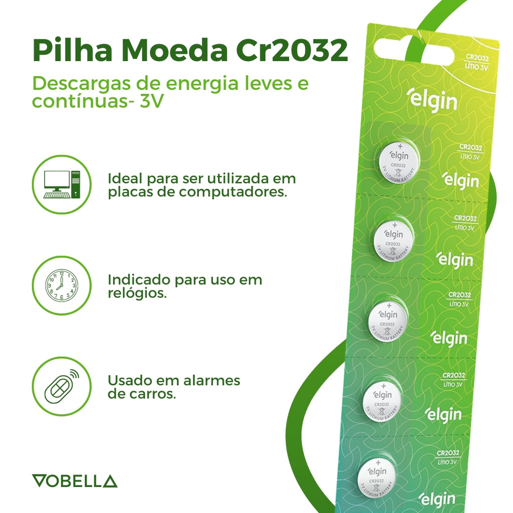 As Pilhas Moeda CR2032 3V Elgin são ideais para quem busca energia duradoura em pequenos dispositivos com segurança e excelente custo-benefício! Sobre o produto: - Marca: Elgin. - Contém:2 Blisters com 5 unidades cada - Modelo: Bateria Moeda CR2032. - Voltagem: 3 Volts - NÃO RECARREGÁVEL. - Dimensões: 3,2 x 20mm. - 0 % de Metais Pesados. - Alta Durabilidade. - Economia e Qualidade. Indicado para: - Computadores. - Relógios. - Alarmes automotivos. Modo de uso: - Abra o compartimento de pilhas do seu aparelho. - Remova as pilhas antigas, se houver. - Insira as Pilhas Moeda Cr2032, garantindo que os polos positivo e negativo estejam na posição correta. - Feche o compartimento das pilhas. - Seu aparelho está pronto para uso novamente! Compatíveis com diversos aparelhos como controles, balanças digitais, brinquedos, relógios, calculadoras e muito mais, elas entregam desempenho estável e prolongado, reduzindo a necessidade de trocas frequentes. Surgiu alguma dúvida? Entre em contato com a gente! Boas Compras :)