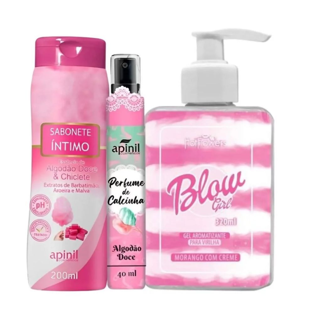 KIT Blow Girl Gel Hidratante Aroma Morango + Sabonete Íntimo + Perfume de Calcinha ALGODÃO DOCE