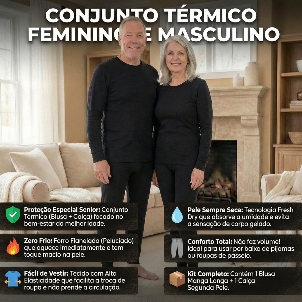 Conjunto Térmico Masculino Senior – Proteção, Calor e Conforto para a Melhor Idade (Blusa + Calça) Cuidado e Proteção Contra o Frio para Quem Você Ama Sabemos que na melhor idade a sensibilidade ao frio aumenta e a proteção precisa ser redobrada. Este Conjunto Térmico Masculino (Segunda Pele) foi selecionado pensando exatamente nisso: manter o corpo do idoso sempre aquecido, seco e confortável, sem limitar os movimentos. É a peça indispensável para o dia a dia, servindo como uma "camada extra de pele" que protege contra ventos, umidade e baixas temperaturas. Pode ser usado por baixo de roupas comuns (camisas, pijamas ou agasalhos) sem pesar ou incomodar. *** Por que este conjunto é ideal para Idosos? 1. Aquecimento Imediato e Toque Macio: O interior é flanelado/peluciado, oferecendo um toque extremamente suave que não irrita a pele sensível. Ele retém o calor natural do corpo, evitando aquela sensação de "friagem" nos ossos e articulações. 2. Praticidade ao Vestir (Alta Elasticidade): Sabemos que roupas apertadas ou rígidas dificultam a rotina. Este tecido possui alta elasticidade, o que facilita muito na hora de vestir e tirar, sendo ideal para idosos com mobilidade reduzida ou para auxiliar cuidadores. Ele ajusta-se ao corpo sem apertar. 3. Saúde da Pele (Tecnologia Fresh Dry): Idosos precisam manter a pele seca para evitar irritações. A tecnologia Fresh Dry com microfuros expulsa a umidade e o suor rapidamente. Isso garante que o corpo não fique úmido e gelado, prevenindo resfriados decorrentes do suor frio. *** Detalhes Técnicos e Benefícios Proteção Térmica Eficiente: Isolamento contra o frio, vento e umidade. Leve e Discreto: Não faz volume. Perfeito para usar por baixo da roupa social, do pijama ou do agasalho de lã. Gola Careca: Confortável, não sufoca e fica invisível sob outras camisas. Composição Inteligente: 100% Poliéster com acabamento Fresh Dry (secagem rápida e regulação térmica). *** O que acompanha o Kit? 01 Blusa Térmica Masculina Manga Longa (Interior Peluciado) 01 Calça Segunda Pele Masculina (Interior Peluciado) *** Tamanhos Disponíveis (Adulto): P / M / G / GG (Recomendamos verificar a tabela de medidas para garantir o conforto máximo, preferindo um tamanho que fique justo, mas não apertado). *** Indispensável no Dia a Dia do Idoso: Para dormir aquecido em noites frias. Para passeios ao ar livre com segurança. Para ficar em casa assistindo TV com total conforto. Para usar sob a roupa em consultas médicas ou viagens. - Proteção Especial Senior: Conjunto Térmico (Blusa + Calça) focado no bem-estar da melhor idade. - Zero Frio: Forro Flanelado (Peluciado) que aquece imediatamente e tem toque macio na pele. - Fácil de Vestir: Tecido com Alta Elasticidade que facilita a troca de roupa e não prende a circulação. - Pele Sempre Seca: Tecnologia Fresh Dry que absorve a umidade e evita a sensação de corpo gelado. - Conforto Total: Não faz volume! Ideal para usar por baixo de pijamas ou roupas de passeio. - Kit Completo: Contém 1 Blusa Manga Longa + 1 Calça Segunda Pele.