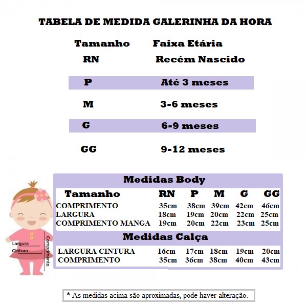 Kit com 3 peças para bebê. Modernas e práticas, essas roupinhas foram confeccionadas em ribana conferindo maior elasticidade e conforto para seu bebê. A calça possui elástico na cintura e punho que ajustam-se ao corpinho durante os movimento do dia a dia. Os bodies tem estampas modernas e divertidas, além de contar com gola envelope e botões de pressão que facilitam as trocas. TABELA DE MEDIDAS: (KIT BODY) MEDIDAS BODY: COMPRIMENTO: BUSTO: COMP. MANGA RN- 35cm RN- 18cm RN- 19cm P- 38cm P- 19cm P- 20cm M- 39cm M- 20cm M- 22cm G- 42cm G- 22cm G- 23cm GG- 46cm GG- 25cm GG- 25cm MEDIDAS CALÇA: COMPRIMENTO: CINTURA: RN- 35cm RN- 16cm P- 36cm P- 17cm M- 38cm M- 18cm G- 40cm G- 19cm GG- 43cm GG- 20cm ATENÇÃO O PRODUTO SERÁ ENVIADO CONFORME A SUA ESCOLHA NÃO SERÁ ENVIADO SORTIDO. ***ATENÇÃO*** é possível comprar vários modelos e tamanhos no mesmo pedido Dúvidas estamos a disposição. ATT: Equipe Galerinha da Hora Composição: 85% Algodão no mínimo