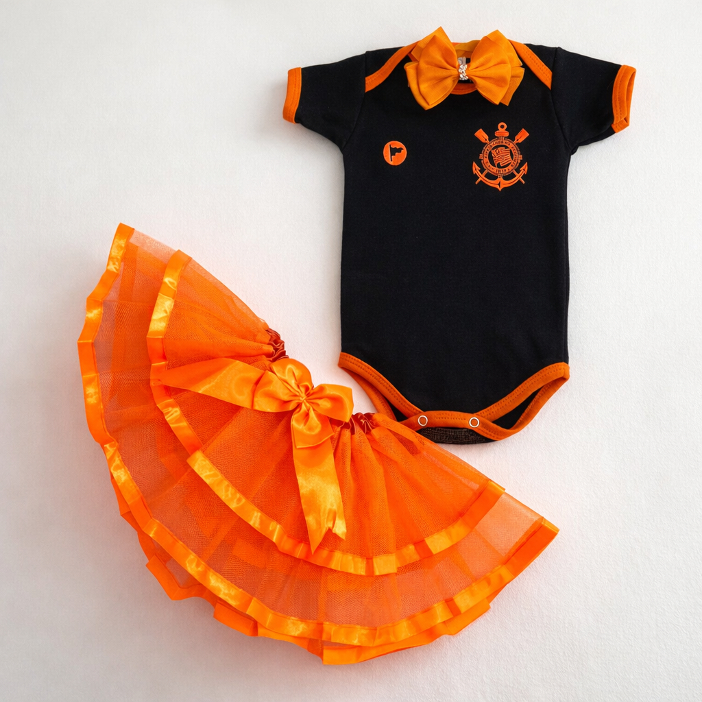 Kit Body Mesversário Corinthians Menina Laranja e Preto com Tule de Luxo & Laço