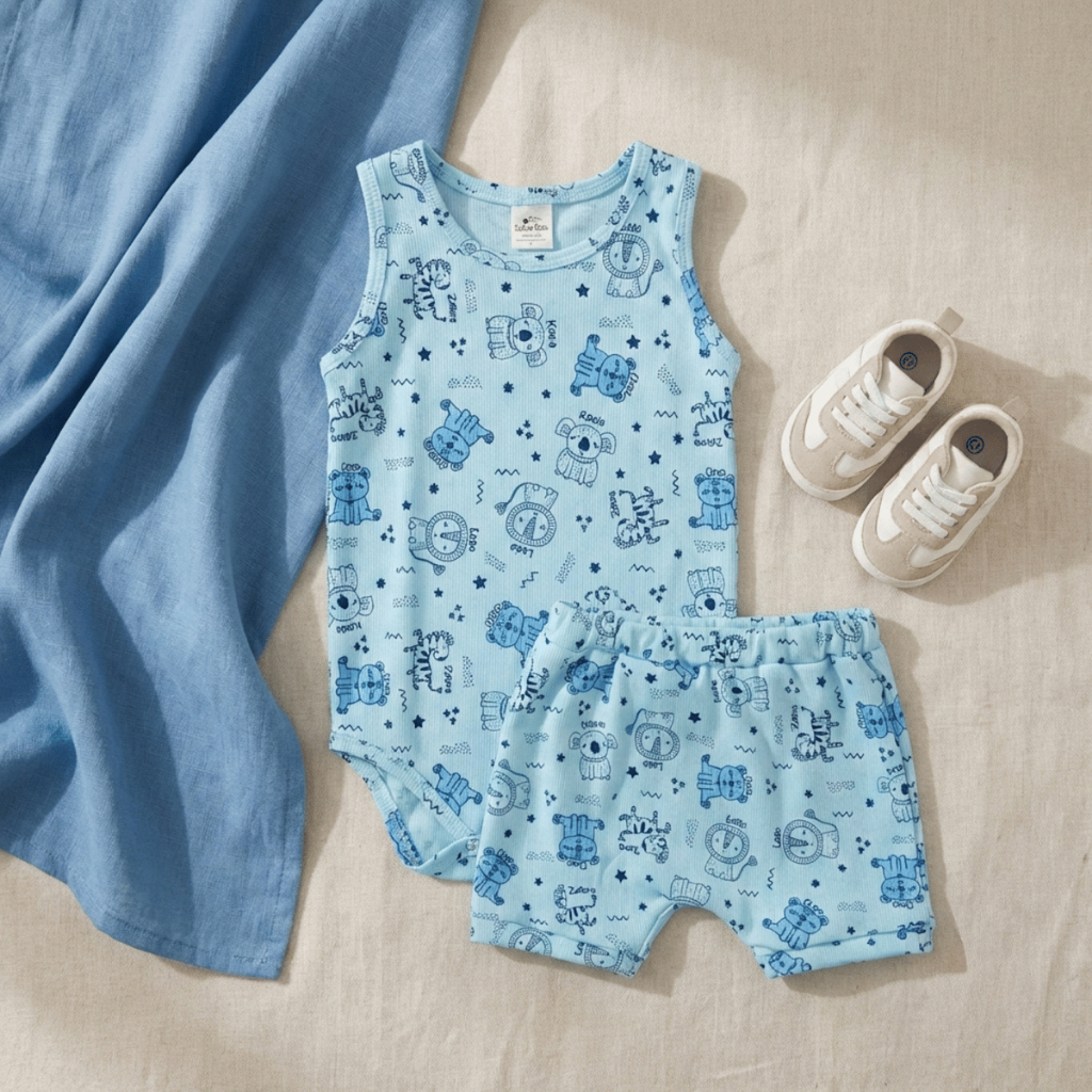 Kit Body Regata de Bebe + Short Canelado Estampado Menino Enxoval de Bebe de Verão 100% Algodão