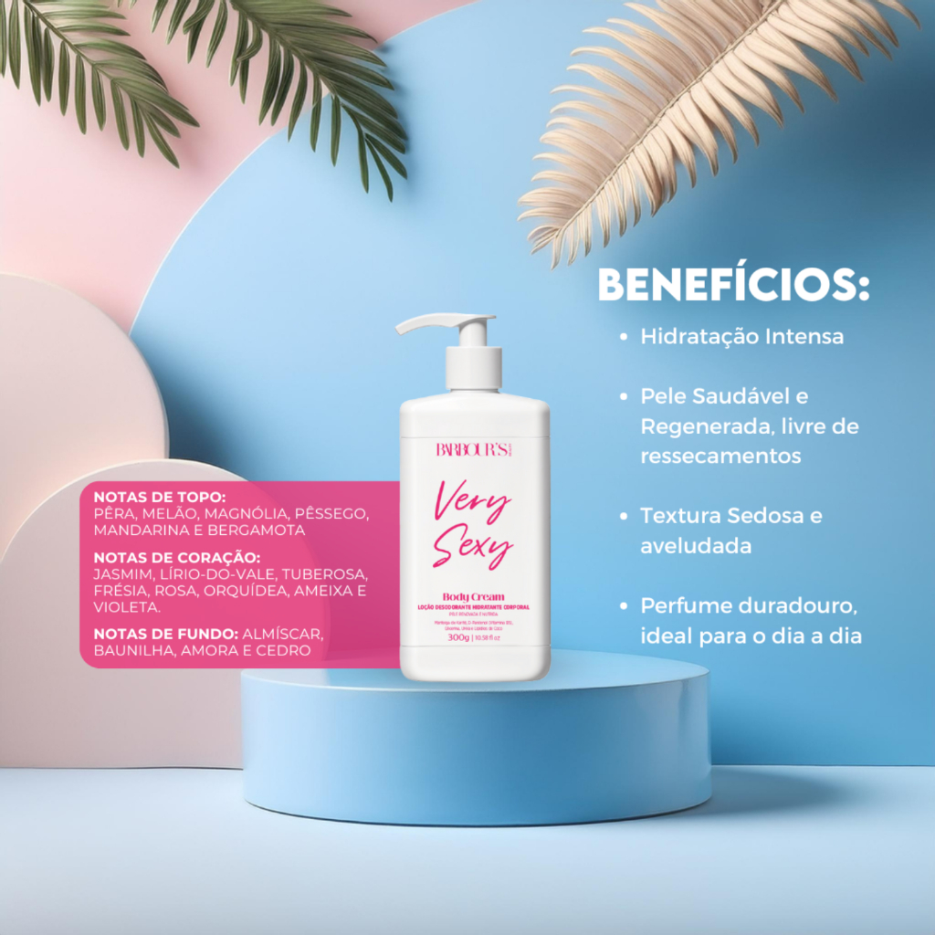 Kit: Body Splash Very Sexy 200ml Hidratante corporal Very Sexy 300g HIDRATANTE: O Body Cream Very Sexy Loção Desodorante Hidratante Corporal oferece hidratação profunda com uma fragrância irresistível, deixando sua pele macia, perfumada e com um brilho sedutor. BODY SPLASH: O Body Splash Very Sexy Desodorante Colônia da Barbour’s Beauty é uma fragrância que celebra a feminilidade em sua forma mais sedutora. NOTAS DA FRAGRÂNCIA: As notas de topo são: Pera, Melão, Magnólia, Pêssego, Mandarina e Bergamota. As notas de coração são: Jasmim, Lírio-do-Vale, Tuberosa, Frésia, Rosa, Orquídea, Ameixa e Violeta. As notas de fundo são: Almíscar, Baunilha, Cedro e Amora. Inspirado em: J'adore** COMPOSIÇÃO: HIDRATANTE: Água, Álcool Cetoestearílico, Glicerina , Alcool Ceto Etoxilado, Ureia, Ciclopentasiloxano, Perfume,Óleo De Coco, Manteiga De Karité, Metossulfato De Behentrimõnio, Fenoxietanol,Etilhexilglicerina, Poliacrilato De Sódio, Extrato De Babosa, Pantenol, EDTA Dissódico, Propilenoglicol, Ácido Lático, Caprilato De Poligliceril-3 Butilenoglicol, DMDM Hidantoína, Butilcarbamato De Iodopropinil, Amil Cinamal, Álcool Benzílico,Benzoato De Benzila, Salicilato De Benzila, Cinamal, Álcool Cinamílico,Citral, Citronelol, Geraniol, Hexil Cinamal,Hidroxicitronelal,Limoneno,Linalol. BODY SPLASH: O Body Splash Very Sexy Desodorante Colônia da Barbour’s Beauty é uma fragrância que celebra a feminilidade em sua forma mais sedutora. **Nota de Esclarecimento sobre Referências Olfativas - Barbour's Beauty Na Barbour's Beauty, desenvolvemos produtos com inspirações olfativas únicas, criados para proporcionar experiências sensoriais distintas e enriquecedoras aos nossos clientes. É importante ressaltar que qualquer menção a outras marcas ou produtos em nossas comunicações visa exclusivamente oferecer uma referência olfativa que facilite a identificação das características aromáticas de nossos produtos. Esclarecimentos Importantes: Independência da Marca: A Barbour's Beauty não possui vínculos com quaisquer outras marcas ou produtos mencionados. As referências são utilizadas estritamente para fins de contextualização olfativa. Propriedade das Marcas: Todas as marcas ou produtos mencionados pertencem a seus respectivos fabricantes e desenvolvedores. Uso de Referências: O uso de descrições olfativas similares é uma ferramenta para enriquecer a experiência do consumidor, oferecendo uma noção preliminar dos aromas, sem sugerir similitude completa com produtos de outras marcas. Inspiração Criativa: A menção de ""inspiração olfativa"" não constitui promessa de resultados idênticos ou similares aos de outros produtos no mercado. Cada composição olfativa da Barbour's Beauty é uma criação exclusiva, com direção artística própria. Compromisso com a Qualidade e Transparência: Na Barbour's Beauty, estamos comprometidos em oferecer produtos de alta qualidade, com fragrâncias exclusivas que verdadeiramente capturam a essência de nossa marca. Nosso objetivo é sempre assegurar transparência e clareza para nossos clientes, garantindo uma experiência de compra autêntica e satisfatória.
