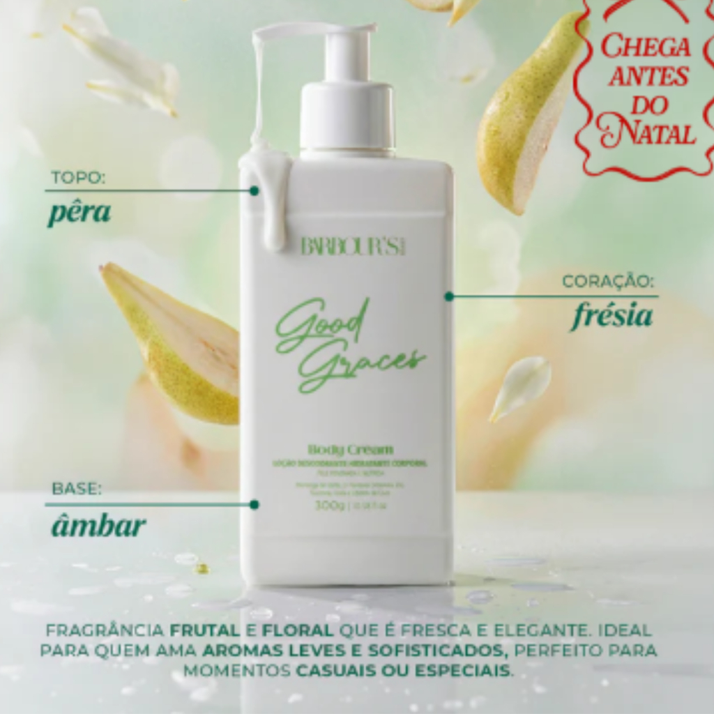 Kit: Body Splash Good Graces200ml Hidratante corporal Good Graces300g Body Splash com uma fórmula leve e refrescante, proporciona um toque perfumado delicado à pele, sem pesar. Perfeita para quem gosta de se manter perfumado ao longo do dia, a amostra permite reaplicações sempre que desejar uma renovação da fragrância. O Body Cream Good Graces é uma Loção Hidratante Desodorante Corporal formulada para oferecer hidratação e nutrição profundas. Com uma textura cremosa de rápida absorção, deixa a pele intensamente nutrida, proporcionando um toque suave, confortável e com uma fragrância duradoura. Cheiro inspirado por: English Pear & Freesia - Jo Malone O Body Cream une ingredientes queridinhos do cuidado com a pele para entregar uma experiência de hidratação rica, envolvente e irresistível. Textura Sedosa: A glicerina e a ureia garantem uma pele com toque aveludado e sedoso com rápida absorção, ideal para todos os tipos de pele. Fragrância: Fragrância frutal e floral que é fresca e elegante. Ideal para quem ama aromas leves e sofisticados, perfeito para momentos casuais ou especiais. COMPOSIÇÃO (PORTUGUÊS): Água, Álcool Cetoestearílico, Glicerol, Álcool Ceto Etoxilado, Ureia, Ciclopentasiloxano, Perfume, Óleo De Coco, Manteiga De Karité, Metossulfato De Behentrimõnio, Fenoxietanol, Etilhexilglicerina, Poliacrilato De Sódio, Extrato De Babosa, Pantenol, Edetato Dissódico, Propilenoglicol, Ácido Lático, Caprilato De Poligliceril-3 Butilenoglicol, DMDM Hidantoína, Butilcarbamato De Iodopropinil, Benzoato De Benzila, Butilfenil Metilpropional, Citral, Citronelol, Farnesol, Geraniol, Limoneno, Linalol. **Nota de Esclarecimento sobre Referências Olfativas - Barbour's Beauty Na Barbour's Beauty, desenvolvemos produtos com inspirações olfativas únicas, criados para proporcionar experiências sensoriais distintas enriquecedoras aos nossos clientes. É importante ressaltar que qualquer menção a outras marcas ou produtos em nossas comunicações visa exclusivamente oferecer uma referência olfativa que facilite a identificação das características aromáticas de nossos produtos. Esclarecimentos Importantes: Independência da Marca: A Barbour's Beauty não possui vínculos com quaisquer outras marcas ou produtos mencionados. As referências são utilizadas estritamente para fins de contextualização olfativa. Propriedade das Marcas: Todas as marcas ou produtos mencionados pertencem a seus respectivos fabricantes e desenvolvedores. Uso de Referências: O uso de descrições olfativas similares é uma ferramenta para enriquecer a experiência do consumidor, oferecendo uma noção preliminar dos aromas, sem sugerir similitude completa com produtos de outras marcas. Inspiração Criativa: A menção de "inspiração olfativa" não constitui promessa de resultados idênticos ou similares aos de outros produtos no mercado. Cada composição olfativa da Barbour's Beauty é uma criação exclusiva, com direção artística própria. Compromisso com a Qualidade e Transparência: Na Barbour's Beauty, estamos comprometidos em oferecer produtos de alta qualidade, com fragrâncias exclusivas que verdadeiramente capturam a essência de nossa marca. Nosso objetivo é sempre assegurar transparência e clareza para nossos clientes, garantindo uma experiência de compra autêntica e satisfatória.
