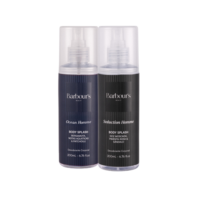 KIT BODY SPLASH MASCULINO OCEAN HOMME + SEDUCTION HOMME BARBOUR’S 200ML O Kit Body Splash Masculino Ocean Homme + Seduction Homme Barbour’s foi desenvolvido para homens que buscam frescor, sofisticação e presença em diferentes momentos do dia. A combinação das duas fragrâncias entrega uma experiência completa: de um lado, o frescor elegante e envolvente do Ocean Homme; do outro, a intensidade marcante e sofisticada do Seduction Homme. O Ocean Homme combina notas aquáticas, especiarias e fundo amadeirado, resultando em uma fragrância limpa, fresca e sofisticada, ideal para acompanhar a rotina com leveza e personalidade. Já o Seduction Homme revela magnetismo e intensidade em uma fragrância amadeirada aromática, com fusão de especiarias, menta e vetiver, criando uma assinatura refinada, envolvente e marcante. Perfeito para uso diário, pós-banho, trabalho, lazer e ocasiões especiais, esse kit oferece versatilidade e elegância na medida certa. Contém: • 1 Body Splash Masculino Ocean Homme Barbour’s 200ml • 1 Body Splash Masculino Seduction Homme Barbour’s 200ml Benefícios: • Duas fragrâncias masculinas sofisticadas e versáteis • Ocean Homme: frescor aquático amadeirado elegante • Seduction Homme: intensidade amadeirada aromática envolvente • Ideal para uso diário e ocasiões especiais • Combinação equilibrada entre frescor, presença e sofisticação Modo de uso: Aplique o Body Splash generosamente sobre a pele limpa e seca, concentrando-se nos pontos de pulsação, como pescoço, pulsos e atrás das orelhas. Reaplique ao longo do dia conforme necessário para manter a fragrância fresca e duradoura. Composição Ocean Homme: Álcool Etílico, Água, Perfume, Fenoxietanol, Farnesol, Laurato de Glicerila, Alfa-Isometil Ionona, Salicilato de Benzila, Citral, Citronelol, Cumarina, Extrato de Evernia Furfuracea, Extrato de Evernia Prunastri, Limoneno, Linalol. Composição Seduction Homme: Álcool Etílico, Água, Perfume, Óleo de Rícino Hidrogenado PEG-40, Fenoxietanol, Farnesol, Laurato de Glicerila, Citral, Cumarina, Limoneno, Linalol. body splash masculino, kit body splash masculino, ocean homme, seduction homme, perfume masculino, fragrância masculina, barbours, barbours body splash, barbours masculino, perfume barbours, perfume aquático masculino, perfume amadeirado masculino, fragrância aromática masculina, perfume fresco masculino, perfume sofisticado masculino, perfume para o dia a dia, kit presente masculino