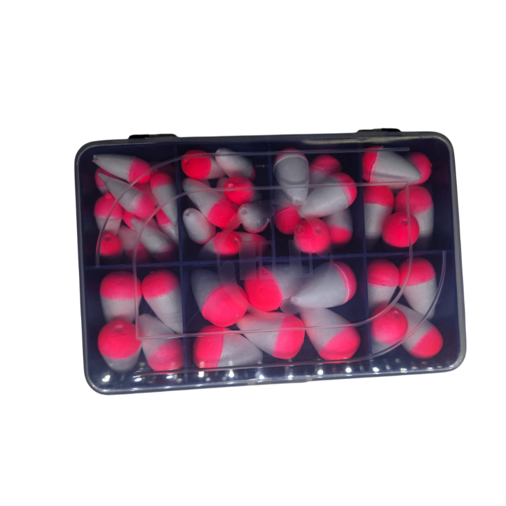 Kit Boias Isopor Pesca com Estojo Organizador Reforçado - 50 Boias Premium - Diversas Medidas