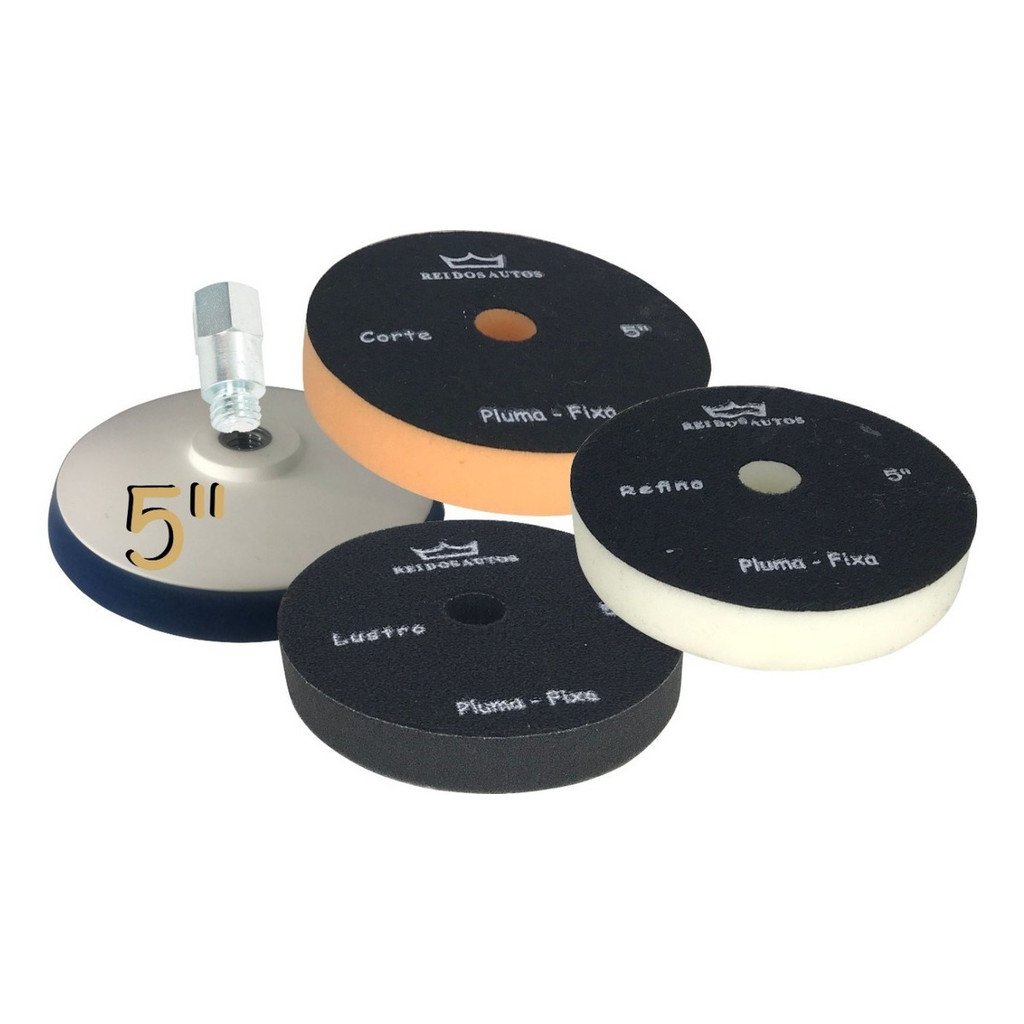 A Rei Dos Autos visando sempre a satisfação completa dos nossos clientes, buscamos uma nova tecnologia de colagem; Desenvolvemos juntamente com uma empresa multinacional uma cola base de adesivo resistente a alta temperatura, a lavagem e higienização com água, para evitar o descolamento da base da espuma, com isso não haverá mais a necessidade de utilização do EVA para isolar a alta temperatura que era exposta a base de cola o que causava o descolamento da mesma. 1- Boina de Espuma Corte Laranja lisa fixação Pluma Fixa 5” 1- Boina de Espuma Refino Branca lisa fixação Pluma Fixa 5” 1- Boina de Espuma Lustro Preta lisa fixação Pluma Fixa 5” 1- Suporte Eva 5" 1- Adaptador politriz m14X5/8 1- Brinde (Espuma Aplicadora) _______________________________________________________________________ Boina de Espuma Corte Laranja Lisa com Sistema de Aderência Pluma Fixa 5” Boina de espuma agressiva para uso com politríz rotativa ou roto orbital na etapa de corte. Aconselhado o uso com compostos polidores fortes e multi-polidores, obtendo alto poder de corte. A Boina de Espuma Agressiva é indicada para eliminação de pequenos defeitos da superfície e restauração do brilho. Seu material de alta tecnologia oferece maior durabilidade. Alta durabilidade e fácil utilização. Características: Possui ótima resistência; Produz brilho intenso; Necessita suporte; Perfeito balanceamento, testado mecanicamente; Flexibilidade ideal para trabalho em superfícies curvas; Fácil reposição; Melhor acabamento; Economia de custo/tempo; Maior durabilidade. Especificação: Boina para polimento de Espuma Laranja Lisa com Sistema de Aderência Material : Espuma importada Diâmetros : 6 polegadas Fixação: Sistema de Aderência Pluma Fixa _______________________________________________________________________ Boina de Espuma Refino Branca Lisa com Sistema de Aderência fixação ganchos 5” A boina de espuma com Sistema de Aderência é ideal para seu trabalho de polimento técnico, com tamanho de 6”, permite fácil acesso a laterais de portas, soleiras, faixas de teto solar, faróis, motos, entre outros. Boina de espuma de corte suave (abrasividade média) para uso com politriz rotativa ou roto orbital na etapa de corte ou refino. Adequada ao uso com compostos polidores fortes, multipolidores e lustradores, obtendo alto poder de refino deixando a pintura pronta para a etapa de lustro. Indicada para eliminação de pequenos defeitos da superfície e restauração do brilho. Características: Possui ótima resistência; Produz brilho intenso; Necessita suporte; Perfeito balanceamento; Flexibilidade ideal para trabalho em superfícies curvas; Fácil reposição; Melhor acabamento; Economia de custo/tempo; Maior durabilidade. Especificação: Boina para polimento de Espuma Branca Lisa com Sistema de Aderência Pluma Fixa Material : Espuma importada Diâmetros : 5 polegadas Fixação: Sistema de Aderência Pluma Fixa _______________________________________________________________________ Boina de Espuma Lustro Preta Lisa com Sistema de Aderência Pluma Fixa 5” A boina de espuma com Sistema de Aderência Pluma Fixa ideal para seu trabalho de polimento técnico, com tamanho de 5”. A boina de espuma Preta Super Macia foi desenvolvida para uso com politríz rotativa ou roto orbital na etapa de lustro e refino com o líquido lustrador. Adequada ao uso com lustradores e compostos multi polidores e removendo hologramas. Sua superfície lisa ou ondulada permite o lustro em áreas críticas como adesivos e cantos, além de sua principal função que é eliminar pequenos riscos na camada de pintura, marcas deixadas pelas boinas de polimento, produzindo um brilho intenso com praticidade e rapidez. Características: Possui ótima resistência; Produz brilho intenso; Necessita suporte; Perfeito balanceamento; Flexibilidade ideal para trabalho em superfícies curvas; Fácil reposição; Melhor acabamento; Economia de custo/tempo; Maior durabilidade. Especificação: Boina para polimento de Espuma Lustro Preta Lisa com Sistema de Aderência Pluma Fixa Material : Espuma importada Diâmetros : 5 polegadas Fixação: Sistema de Aderência Pluma Fixa