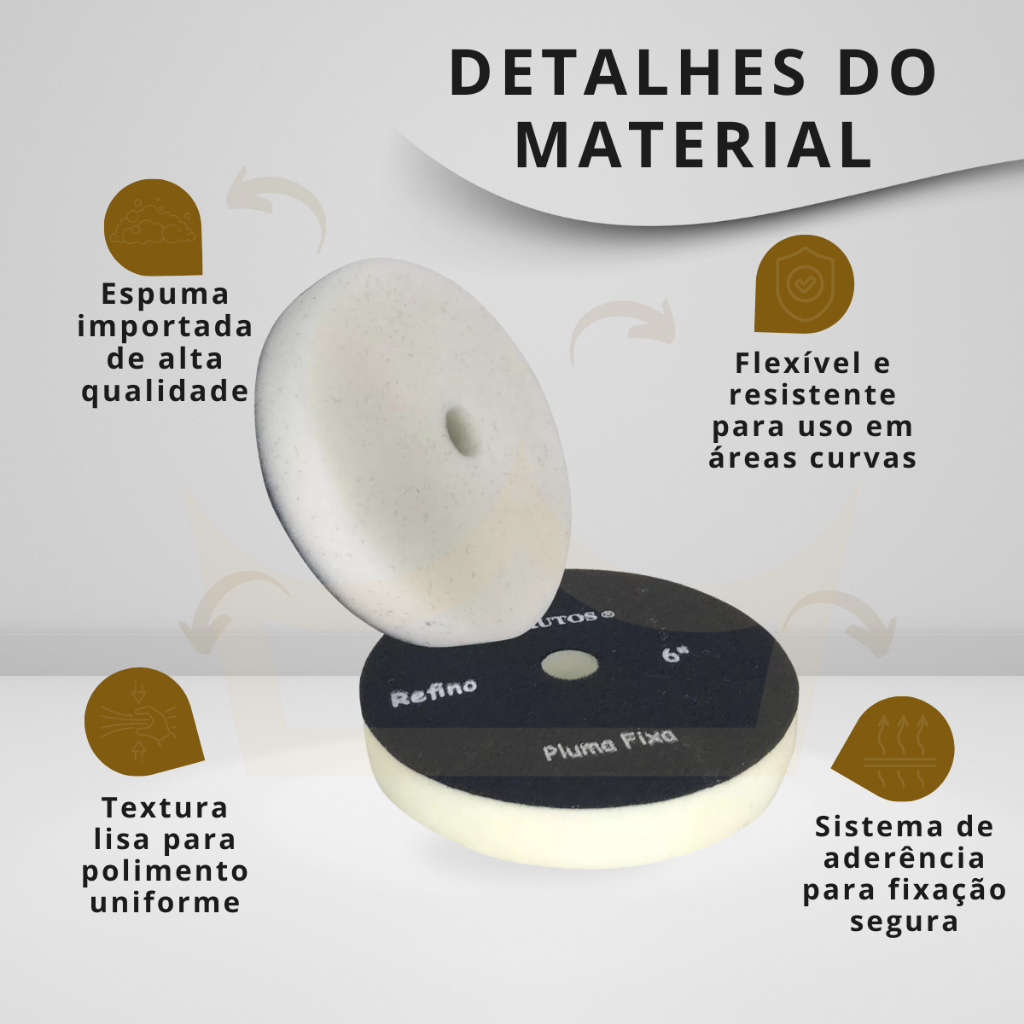 A Rei Dos Autos visando sempre a satisfação completa dos nossos clientes, buscamos uma nova tecnologia de colagem; Desenvolvemos juntamente com uma empresa multinacional uma cola base de adesivo resistente a alta temperatura, a lavagem e higienização com água, para evitar o descolamento da base da espuma, com isso não haverá mais a necessidade de utilização do EVA para isolar a alta temperatura que era exposta a base de cola o que causava o descolamento da mesma. 1- Boina de Espuma Corte Laranja lisa fixação Pluma Fixa 6” 1- Boina de Espuma Refino Branca lisa fixação Pluma Fixa 6” 1- Boina de Espuma Lustro Preta lisa fixação Pluma Fixa 6” 1- Suporte Eva 6" 1- Adaptador politriz m14X5/8 1- Brinde (Espuma Aplicadora) _______________________________________________________________________ Boina de Espuma Corte Laranja Lisa com Sistema de Aderência Pluma Fixa 6” Boina de espuma agressiva para uso com politríz rotativa ou roto orbital na etapa de corte. Aconselhado o uso com compostos polidores fortes e multi-polidores, obtendo alto poder de corte. A Boina de Espuma Agressiva é indicada para eliminação de pequenos defeitos da superfície e restauração do brilho. Seu material de alta tecnologia oferece maior durabilidade. Alta durabilidade e fácil utilização. Características: Possui ótima resistência; Produz brilho intenso; Necessita suporte; Perfeito balanceamento, testado mecanicamente; Flexibilidade ideal para trabalho em superfícies curvas; Fácil reposição; Melhor acabamento; Economia de custo/tempo; Maior durabilidade. Especificação: Boina para polimento de Espuma Laranja Lisa com Sistema de Aderência Material : Espuma importada Diâmetros : 6 polegadas Fixação: Sistema de Aderência Pluma Fixa _______________________________________________________________________ Boina de Espuma Refino Branca Lisa com Sistema de Aderência fixação ganchos 6” A boina de espuma com Sistema de Aderência é ideal para seu trabalho de polimento técnico, com tamanho de 6”, permite fácil acesso a laterais de portas, soleiras, faixas de teto solar, faróis, motos, entre outros. Boina de espuma de corte suave (abrasividade média) para uso com politriz rotativa ou roto orbital na etapa de corte ou refino. Adequada ao uso com compostos polidores fortes, multipolidores e lustradores, obtendo alto poder de refino deixando a pintura pronta para a etapa de lustro. Indicada para eliminação de pequenos defeitos da superfície e restauração do brilho. Características: Possui ótima resistência; Produz brilho intenso; Necessita suporte; Perfeito balanceamento; Flexibilidade ideal para trabalho em superfícies curvas; Fácil reposição; Melhor acabamento; Economia de custo/tempo; Maior durabilidade. Especificação: Boina para polimento de Espuma Branca Lisa com Sistema de Aderência Pluma Fixa Material : Espuma importada Diâmetros : 6 polegadas Fixação: Sistema de Aderência Pluma Fixa _______________________________________________________________________ Boina de Espuma Lustro Preta Lisa com Sistema de Aderência Pluma Fixa 6” A boina de espuma com Sistema de Aderência Pluma Fixa ideal para seu trabalho de polimento técnico, com tamanho de 5”. A boina de espuma Preta Super Macia foi desenvolvida para uso com politríz rotativa ou roto orbital na etapa de lustro e refino com o líquido lustrador. Adequada ao uso com lustradores e compostos multi polidores e removendo hologramas. Sua superfície lisa ou ondulada permite o lustro em áreas críticas como adesivos e cantos, além de sua principal função que é eliminar pequenos riscos na camada de pintura, marcas deixadas pelas boinas de polimento, produzindo um brilho intenso com praticidade e rapidez. Características: Possui ótima resistência; Produz brilho intenso; Necessita suporte; Perfeito balanceamento; Flexibilidade ideal para trabalho em superfícies curvas; Fácil reposição; Melhor acabamento; Economia de custo/tempo; Maior durabilidade. Especificação: Boina para polimento de Espuma Lustro Preta Lisa com Sistema de Aderência Pluma Fixa Material : Espuma importada Diâmetros : 6 polegadas Fixação: Sistema de Aderência Pluma Fixa