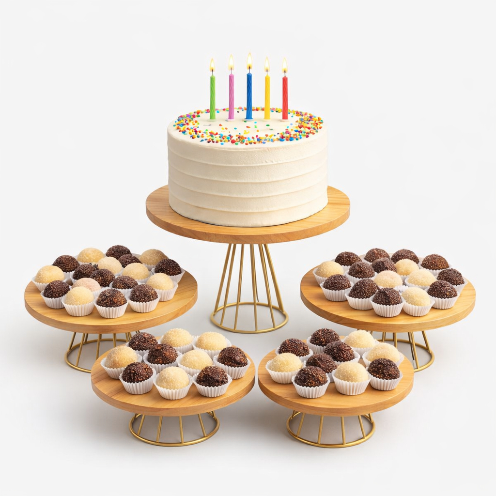 Kit Boleira para Festa com Suportes para Doces – Base de Madeira e Metal Dourado