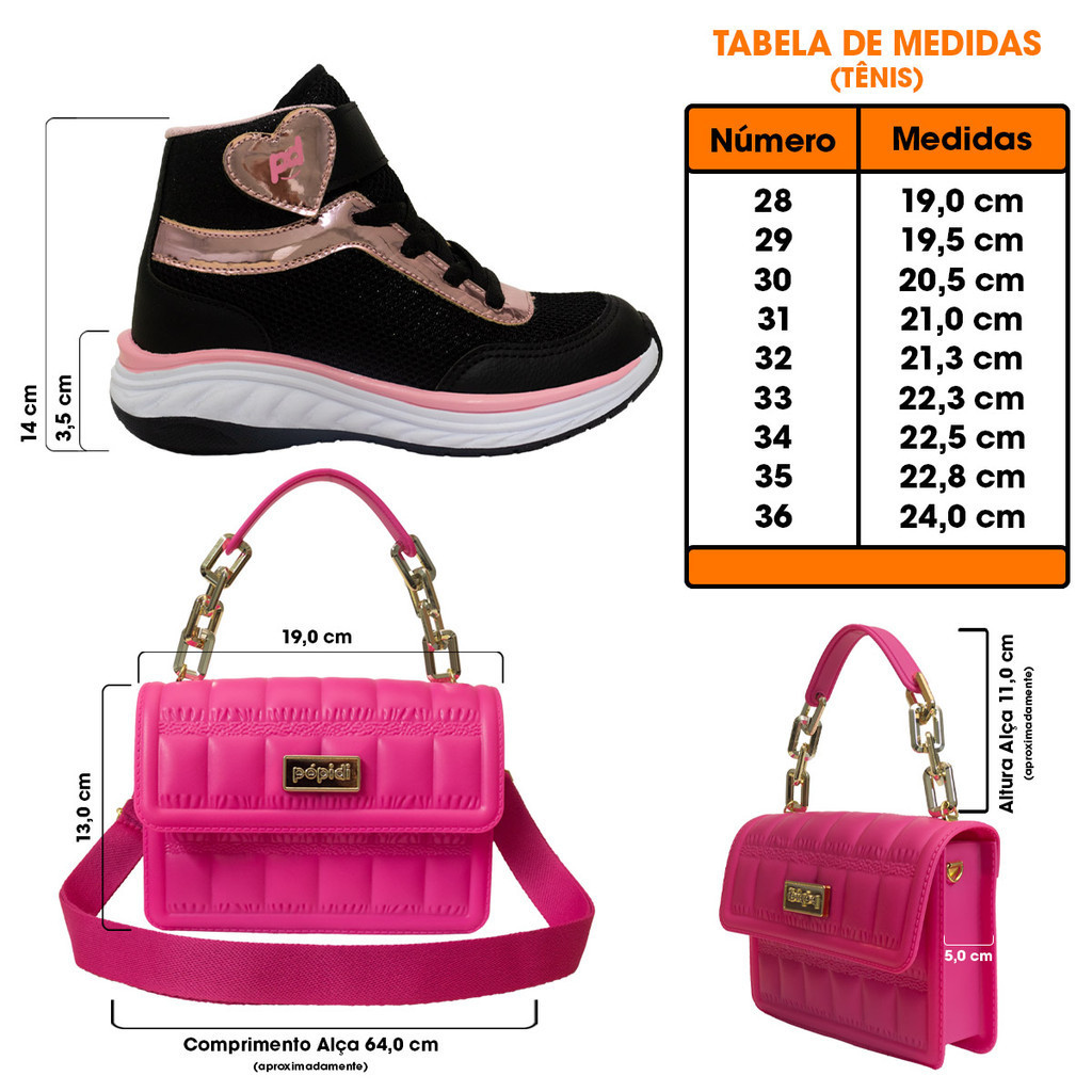 Composição do kit: 01 par de tênis 01 bolsa Cores Disponíveis do kit: * Preto/Preto * Preto/Pink * Branco/Off White Especificação Técnica do Tênis: * Tipo de produto: Tênis Juvenil Menina. * Material externo: Poliester. * Material interno: Poliester. * Palmilha: EVA. * Sola: PVC Micro Expandido. * Altura da sola: 3,5cm. * Peso médio do produto: 730 gramas. * Fechamento: Calce fácil + cadarço * Numeração: Será enviada pelo critério de escolha. * Embalagem: Entregue em caixa individual. Tabela de medidas * 28 ---------------- 19,0 cm * 29 ---------------- 19,5 cm * 30 ---------------- 20,5 cm * 31 ---------------- 21,0 cm * 32 ---------------- 21,3 cm * 33 ---------------- 22,3 cm * 34 ---------------- 22,5 cm * 35 ---------------- 22,8 cm * 36 ---------------- 24,0 cm Como medir: Coloque o pé em cima de uma folha de papel e risque em volta dele com um lápis ou caneta. Meça o comprimento do topo até a base do contorno e adicione 0,5 cm de folga. Limpeza e Conservação: Evite usar substâncias abrasivas como álcool, detergentes ou solventes nos calçados. Nunca os mergulhe na água, os deixe de molho ou lave na máquina. A secagem dos produtos deve ser feita à temperatura ambiente e na sombra, nunca no sol ou em máquinas. Especificação Técnica da Bolsa: * Tipo de produto: Bolsa Infantil. * Material externo: PVC. * Material interno: PVC. * Alça: Regulável. * Peso médio do produto: 390 gramas. * Fechamento: Botão (pressão). * Embalagem: Esse produto não é enviado em caixa individual. Tabela de medidas Altura Altura da alça Largura 13,0 cm Aprox. 64,0 cm 5,0 cm Limpeza e Conservação: Fácil de lavar e de secar! Evite usar substâncias abrasivas como álcool, detergentes ou solventes nos calçados. Nunca os mergulhe na água, os deixe de molho ou lave na máquina. A secagem dos produtos deve ser feita à temperatura ambiente e na sombra, nunca no sol ou em máquinas. Dicas Pópidi O kit bolsa de alças e tênis cano alto é a combinação essencial de estilo e praticidade para o dia a dia das pequenas. O tênis cano alto é conhecido pelo seu conforto e estilo, perfeitos para atividades ao ar livre, mantendo os pés das pequenas confortáveis e oferecendo sustentação ao caminhar. Já a nossa bolsa de alças que acompanha o kit é prática e charmosa, feita de materiais duráveis, fáceis de limpar e com design compacto, é perfeita para as crianças carregarem seus pequenos pertences, como brinquedos e acessórios. Para passeios na cidade, combine o kit com roupas leves e confortáveis, e para aquele toque mais estiloso, aposte em calças cargo e jeans rasgados, já em ocasiões especiais, como eventos esportivos ou festas temáticas, o tênis com roupas apropriadas e a bolsa como acessório funcional são o par perfeito. Sobre a marca: Conectados com o universo infantil através de produtos que transmitem nossos valores, a Pópidi acompanha o dia a dia da criança com muito respeito, dedicação e atitude, desde o nascimento até a pré-adolescência. Oferecemos proteção, conforto e estilo, buscando sempre inovar a cada lançamento. Cuidando com excelência da relação pré e pós vendas, afinal a satisfação de nossos clientes é muito importante para nós. Atendimento: Segunda à sexta: 07:00 às 18:00 Sábado: 08:00 às 12:00 Boas compras e volte sempre!!!