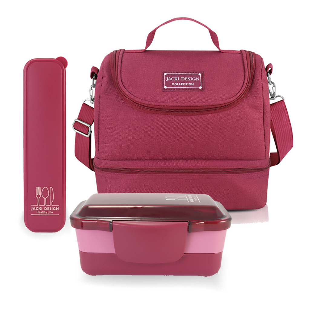 Kit Bolsa Térmica C/ 2 Compartimentos + Marmita + Porta Talheres 3 Peças Várias Cores - Jacki Design A nova coleção JOY, foi criada pensando em oferecer mais praticidade e estilo para o consumidor moderno! O Kit com 3 Peças é composto por Bolsa Térmica com 2 Compartimentos da Jacki Design feita de multicamadas e folha de alumínio para manter seu alimento fresco e bem conservado, a Marmita de 950ml e 1200mL (Preta e Azul Jeans) possui 2 andares, podendo ser usado em conjunto ou separadamente e feito de material polipropileno, é resistente e possui tampa com travas para segurança evitando acidentes, livre de BPA e o Porta Talheres, um item essencial para transportar com higiene e segurança seus talheres, feita de material Polipropileno, ele é compacto e fácil de limpar. **OBSERVAÇÃO** - Os Kits Preto e Azul Jeans são compostos por marmitas de 1200mL. - o Kit Rosa é Composto por Marmita de 750mL com Talheres Inclusos. - Todas as Marmitas São Duplas (2 Andares). CUIDADOS GERAIS: - Bolsa Térmica: Limpe a bolsa térmica com um pano úmido. Caso necessário, use sabão neutro ou álcool para higienizar o local. Deixe secar na sombra. ATENÇÃO: Para preservar a vida útil do produto, recomendamos não deixar a bolsa de molho, não levar a máquina de lavar e também não utilizar produtos químicos. - Marmita: Retire a tampa antes de levar ao micro-ondas; usar somente para aquecer comida, não para cozinhar; Vai ao freezer e lava-louças; Temperatura de uso: -20°C ~120°C; Limpe usando uma esponja macia e detergente). - Porta Talheres: Feita de material Polipropileno, ele é compacto e fácil de limpar. *Acessórios meramente ilustrativos - NÃO ACOMPANHA TALHERES* Medidas: - Bolsa Térmica: Comprimento: 23cm x Largura: 14cm x Altura: 20cm. - Marmita Vinho, Azul, Cinza e Verde: Comprimento: 19cm x Largura: 12,7cm x Altura: 9,4cm (950mL). - Marmita Preta e Azul Jeans: Comprimento: 22,5cm x Largura: 9cm x Altura: 13cm (1200mL). - Marmita Rosa: Comprimento: 18cm x Largura: 8cm x Altura: 8cm (750mL). - Porta Talheres: Comprimento: 25cm x Largura: 6cm x Altura: 3cm.