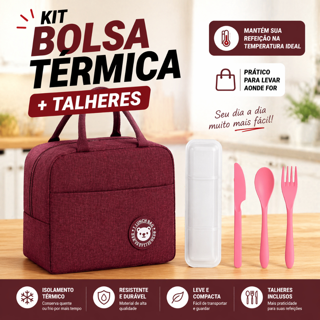 Kit Bolsa Térmica Para Marmita Lancheira Com Alça Viagem + Porta Talher Feminina Masculina
