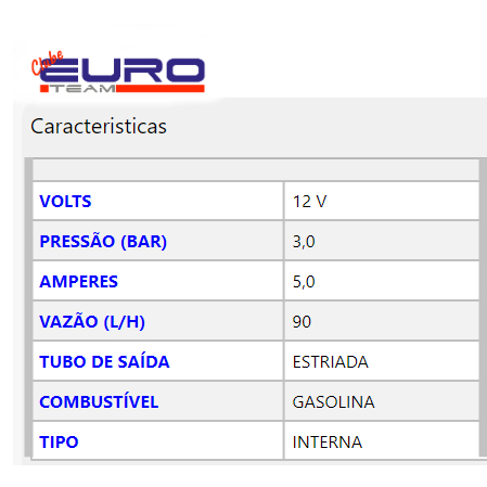 ATENÇÃO TIRE TODAS AS DÚVIDAS ANTES DE EFETUAR A COMPRA! CONFIRME O VEÍCULO / ANO / MODELO DO CARRO NOS CAMPOS DE COMENTÁRIOS ANTES DE REALIZAR A COMPRA. DESSA FORMA EVITAMOS O TRANSTORNO DE PEÇAS INCORRETAS / DEVOLUÇÕES. ______________ LINHA DE PRODUTO BOMBA COMBUSTÍVEL ______________ CONTEÚDO: 01 (UMA) BOMBA COMBUSTÍVEL CÓDIGO: 10107 MARCA: EURO POLO COMBUSTÍVEL: GASOLINA ________________ APLICAÇÃO FIAT: FIORINO FURGÃO 1.5 MPI 1997 A 2002 FIORINO PICK-UP 1.5 MPI 1997 A 2002 PALIO 1.0 16V FIASA MPI 1996 A 2003 PALIO 1.0 16V FIRE MPI 2001 A 2003 PALIO 1.0 8V FIASA MPI 1996 A 2003 PALIO 1.0 8V FIRE MPI 2001 A 2003 PALIO 1.0 MPI 16V 2000 A 2002 PALIO 1.3 16V FIRE MPI 2001 A 2003 PALIO 1.3 8V FIRE MPI 2001 A 2003 PALIO 1.5 16V FIASA MPI 1996 A 2003 PALIO 1.5 8V FIASA MPI 1996 A 2003 PALIO 1.6 16V FIASA MPI 1996 A 2003 PALIO 1.6 8V FIASA MPI 1996 A 2003 PALIO WEEKEND 1.5 16V MPI 1997 A 2003 PALIO WEEKEND 1.5 8V MPI 1997 A 2003 PALIO WEEKEND 1.6 8V MPI 1997 A 2003 PALIO WEEKEND 1.8 8V MPI 2003 A 2003 SIENA 1.0 16V FIASA MPI 1996 A 2003 SIENA 1.0 16V FIRE MPI 2001 A 2003 SIENA 1.0 8V FIASA MPI 1996 A 2003 SIENA 1.0 8V FIRE MPI 2001 A 2003 SIENA 1.3 16V FIRE MPI 2001 A 2003 SIENA 1.3 8V FIRE MPI 2001 A 2003 SIENA 1.5 16V FIASA MPI 1996 A 2003 SIENA 1.5 8V FIASA MPI 1996 A 2003 SIENA 1.6 16V FIASA MPI 1996 A 2003 SIENA 1.6 8V FIASA MPI 1996 A 2003 STRADA 1.0 16V FIASA MPI 1996 A 2003 STRADA 1.0 16V FIRE MPI 2001 A 2003 STRADA 1.0 8V FIASA MPI 1996 A 2003 STRADA 1.0 8V FIRE MPI 2001 A 2003 STRADA 1.3 16V FIRE MPI 2001 A 2003 STRADA 1.3 8V FIRE MPI 2001 A 2003 STRADA 1.5 16V FIASA MPI 1996 A 2003 STRADA 1.5 8V FIASA MPI 1996 A 2003 STRADA 1.6 16V FIASA MPI 1996 A 2003 STRADA 1.6 8V FIASA MPI 1996 A 2003 UNO 1.0 FIRE MPI 2001 ATÉ 2003 FORD: ESCORT 1.6 2000 A 2002 ESCORT 1.8 16V 1996 A 2002 ESCORT SEDAN 1.8 16V 1996 A 200 ESCORT SW 1.61 2000 A 2002 ESCORT SW 1.8 16V 1996 A 2002 ESCORT XR3 2.0 1994 A 1996 ROYALE 2.01 1991 A 1996 VERONA 2.01 1994 A 1996 VERSAILLES 2.01 1991 A 1996 GM: BLAZER 2.2 MPFI 1997 ATÉ 2003 CORSA 1.0 16V MPFI 1999 ATÉ 2003 CORSA 1.0 8V MPFI 1999 ATÉ 2003 CORSA 1.6 16V MPFI 1999 ATÉ 2003 CORSA 1.6 8V MPFI 1999 ATÉ 2003 IPANEMA 2.0 MPFI 1997 ATÉ 2003 KADETT 2.0 MPFI 1997 ATÉ 2003 S10 2.2 MPFI 1997 ATÉ 2003 MERCEDES-BENZ: CLASSE A 160 1999 A 2003 CLASSE A 190 2000 ATÉ 2003 VOLKSWAGEN: GOL 1.0 MI 16V TURBO 1996 A 2003 GOL 1.8 MI 1996 A 2003 GOL 2.0 MI 16V GTI 1994 A 1999 GOL 2.0 MI 1996 A 2003 GOL 2.01 1994 A 1999 GOL G2 1.0 8V MI 1996 A 1997 GOL G2 1.0 MI SPECIAL 8V 16V 1999 A 1999 GOL G2 1.0 MI SPECIAL 8V 1999 A 1999 GOL G2 1.6 MI 1996 A 2002 GOL G2 1.8 MI 1996 A 2002 GOL G3 1.6 MI 1999 A 2003 GOL G3 1.8 MI 1999 A 2003 GOL G3 2.0 MI 1999 A 2003 KOMBI 1.6 MI 1997 A 2003 LOGUS 2.01 1994 A 1996 PARATI 1.6 MI 1996 A 2003 PARATI 1.8 MI 1996 A 2003 PARATI 2.0 MI 16V GTI 1994 A 1999 PARATI 2.0 MI 16V GTI 1996 A 2003 PARATI 2.0 MI 1996 A 2003 PARATI 2.0I 1994 A 1999 PARATI G2 1.0 MI 16V 1997 A 1999 PARATI G2 1.6 MI 1996 A 1999 PARATI G2 1.8 MI 1996 A 1999 PARATI G3 1.0 MI 16V 1997 A 1999 PARATI G3 1.0 MI 16V TURBO 1996 A 2003 POINTER 2.0I 1995 A 1996 QUANTUM 2.0I 1990 A 1996 QUANTUM 2.0 MI 1996 A 2003 SANTANA 2.0 MI 1996 A 2003 SANTANA 2.0I 1990 A 1996 SAVEIRO G2 1.6 MI 1997 A 2000 SAVEIRO G2 1.8 MI 1997 A 2000 SAVEIRO G2 2.0 MI 1997 A 2000 SAVEIRO G3 1.6 MI 1999 A 2003 SAVEIRO G3 1.8 MI 1999 A 2003 SAVEIRO G3 2.0 MI 1999 A 2003 ---------------------------- ESPECIFICAÇÕES AMPERES: 5,0 COMBUSTÍVEL: GASOLINA PRESSÃO (BAR): 3,0 TIPO: INTERNA TUBO DE SAÍDA: ESTRIADA VAZÃO (L/H): 90 VOLTS: 12V ---------------------------- CÓDIGO REFERÊNCIA: BOSCH: 580454093 F000TEO103 SUBST. O580453471 DELPHI: FE10103 MAGNETI MARELLI: MM103A WEBER: WB0011 EURO: 10107 OBS: KIT COMPLETO CONFORME FOTO DE CAPA!!! GARANTIA DO FABRICANTE: 3 MESES É NOVO, E ACOMPANHA NOTA FISCAL ---------------------------- NÃO NOS RESPONSABILIZAMOS POR DEFEITOS OCORRIDOS POR MÁ INSTALAÇÃO DO PRODUTO. TODO O PRODUTO DEVE SER INSTALADO POR UM PROFISSIONAL QUALIFICADO. AS COMPRAS REALIZADAS EM NOME DE PESSOA JURÍDICA ESTÃO SUJEITAS À COBRANÇA DE ICMS, CONFORME PROTOCOLO ICMS 41, DE 4 DE ABRIL DE 2008. CASO VOCÊ TENHA DÚVIDAS SOBRE O PERCENTUAL A SER APLICADO, CONSULTE A CLÁUSULA SEGUNDA, §1° DO REFERIDO PROTOCOLO. FOTOS MERAMENTE ILUSTRATIVAS ---------------------------- SOBRE A EMPRESA SOMOS UMA EMPRESA ESPECIALIZADA NA VENDA DE PEÇAS AUTOMOTIVAS, COM AMPLA EXPERIÊNCIA NO MERCADO E COMPROMISSO COM A SATISFAÇÃO DE NOSSOS CLIENTES. TRABALHAMOS APENAS COM PRODUTOS NOVOS, DE QUALIDADE E PROCEDÊNCIA GARANTIDA, OFERECENDO SEGURANÇA E CONFIABILIDADE EM CADA COMPRA. NOSSO OBJETIVO É PROPORCIONAR UM ATENDIMENTO ÁGIL, TRANSPARENTE E DE EXCELÊNCIA. EM CASO DE DÚVIDAS, ENTRE EM CONTATO COM A NOSSA EQUIPE — SERÁ UM PRAZER TE ATENDER!