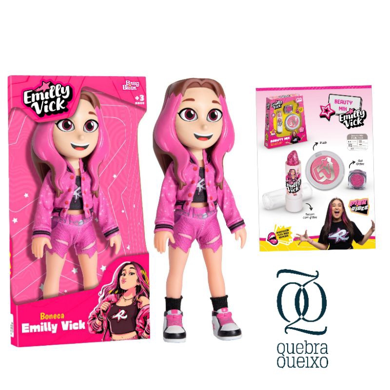 Apresentamos a Vocês o kit da Emilly Vick: Contem: 01 Boneca da Emilly Vick 25cm Articulada - Baby brink 01 Conjunto de Maquiagem - Beauty Mix Brink Model ( Contem 01 Baton com Glitter + 01 Blush e 01 Gel Glitter ) Toda linha de maquiagem é Hipoalergênico, Testado dermatologicamente, produzido especialmente para crianças.