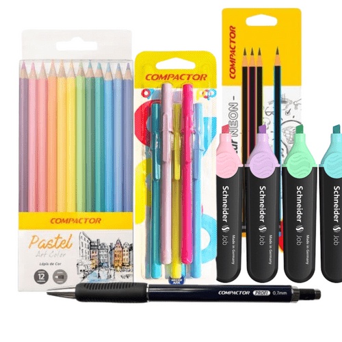 Esse kit é bem especial, pois além de ser completo tem tudo que um estudante precisa. Nosso lápis Tristar que não pode faltar, canetas 07 Pop, para dar aquela colorida no estojo, lembrando que todas as cores são azul. Uma lapiseira profissional pra ninguém botar defeito, marcadores Job da Schneider em tom pastel para arrasar nos resumos e claro, lápis de cor também em tom pastel para entrar na onda da pastel mania. Com um estojo desse, você já está completamente preparado para começar o ano letivo!