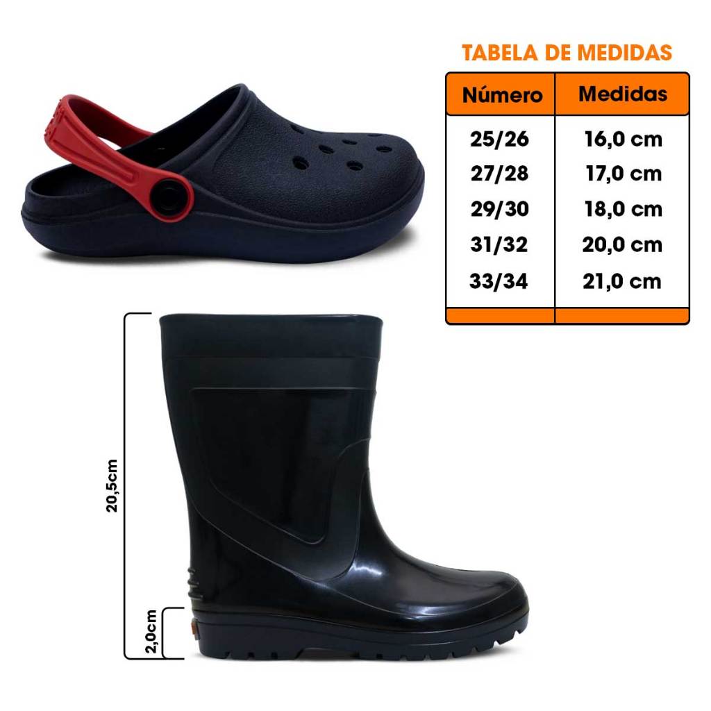 KIT GALOCHA + BABUCHE Composição do kit: 01 par de galocha 01 par de babuche Cores Disponíveis do kit: • Preto/Preto-Vermelho • Marinho/Marinho • Rosa/Rosa • Glitter Prata/Pink Especificação Técnica: • Tipo de produto: Galocha Cano Alto Infantil. • Material externo: Injetado PVC. • Material interno: Injetado PVC. • Palmilha: EVA Confortável. • Sola: Injetado PVC. • Peso médio do produto: 877 gramas. • Tipo de Salto: Sem salto. • Altura da sola: 2,0 cm. • Fechamento: Calce Fácil. • Numeração: Será enviada pelo critério de escolha. • Embalagem: Esse produto não é entregue em caixa individual. Especificação Técnica do Babuche: • Tipo de produto: Babuche Infantil. • Material externo: PVC. • Material interno: PVC. • Sola: PVC. • Peso médio do produto: 290 gramas. • Altura da sola: 2,0 cm. • Fechamento: Calce fácil. • Numeração: Será enviada pelo critério de escolha. • Embalagem: Esse produto não é entregue em caixa individual. Tamanho da Forma: Normal - Recomendamos que compre o tamanho padrão de uso, para melhor calce e maior conforto. Tabela de Medidas: 25/26 ---------------- 16,0 cm 27/28 ---------------- 17,0 cm 29/30 ---------------- 18,0 cm 31/32 ---------------- 20,0 cm 33/34 ---------------- 21,0 cm Como Medir: Coloque o pé em cima de uma folha de papel e risque em volta dele com um lápis ou caneta. Meça o comprimento do topo até a base do contorno e adicione 0,5 cm de folga. Limpeza e Conservação: Fácil de lavar e de secar! Evite usar substâncias abrasivas como álcool, detergentes ou solventes nos calçados. Nunca os mergulhe na água, os deixe de molho ou lave na máquina. A secagem dos produtos deve ser feita à temperatura ambiente e na sombra, nunca no sol ou em máquinas. Dicas Pópidi: O kit galocha e babuche é a opção perfeita para dias longos e divertidos. O babuche é conhecido pela sua leveza e composição extremamente confortável, com calce fácil e solado flexível, é perfeito para atividades ao ar livre, oferecendo sustentação ao caminhar. Já a nossa galocha que acompanha o kit é prática e estilosa, feita de materiais duráveis, fáceis de limpar e com cores lindas! É perfeita para montar combinações diferentes ou aproveitar os dias chuvosos. Para destacar esse kit encantador, combine-o com roupas neutras ou sólidas, como peças jeans, sendo shorts/bermudas, calças e camisetas básicas. A moda é você quem faz e com a Pópidi fica muito fácil ser quem quiser. Sobre a Marca: Conectados com o universo infantil através de produtos que transmitem nossos valores, a Pópidi acompanha o dia a dia da criança com muito respeito, dedicação e atitude, desde o nascimento até a pré-adolescência. Oferecemos proteção, conforto e estilo, buscando sempre inovar a cada lançamento. Cuidando com excelência da relação pré e pós-vendas, afinal a satisfação de nossos clientes é muito importante para nós. Atendimento: Segunda à sexta: 07:00 às 17:30 Sábado: 08:00 às 12:00 Boas compras e volte sempre!!!