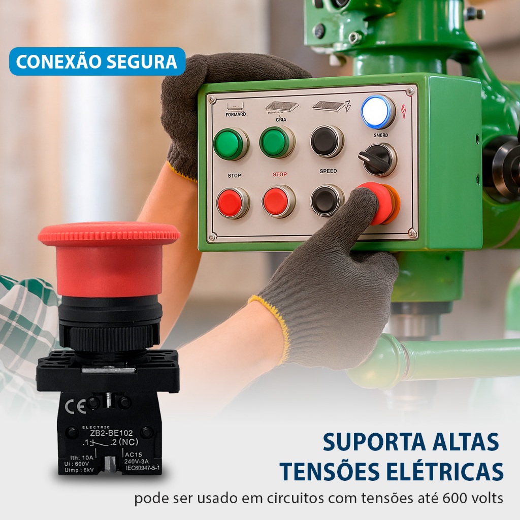 BOTÃO COGUMELO C/ RETENÇÃO 1NF + PLACA DE EMERGÊNCIA • Botão cogumelo, ou botão de emergência, normalmente utilizado para parada de emergência em máquinas e equipamentos. Possui formato de cogumelo para fácil acionamento e sistema do tipo gira e destrava, ou seja, após pressionado, ele será travado e só retornará a posição original ao girá-lo. • Para destravar, é necessário girar o botão, garantindo que o religamento só ocorra de forma intencional. Muito usado em painéis elétricos e comandos industriais para garantir a segurança dos operadores. ITENS DA EMBALAGEM: • 1un | Botão Cogumelo C/ Retenção (Gira & Destrava) 1NF - Vermelho • 1un | Placa de Emergência ESPECIFICAÇÕES: • Fabricado em Plástico ABS; • Opera em temperaturas de -25°C até +70°C; • Fácil instalação, utilizando uma porca traseira; • Produto condizente com a norma IEC 60947-5-1, NR12; • Produto contém proteção IP65 (resistente a poeira e respingos d'água); • Suporta uma tensão nominal máxima de 600v e uma corrente nominal de 10a. DIMENSÕES DO BOTÃO: • Largura: 40mm (4cm); • Altura: 74mm (7,4cm);