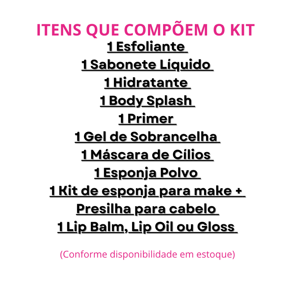 ATENÇÃO AS INFORMAÇÕES O Kit é composto por 10 itens conforme foto podendo apenas escolher a fragrância do kit porán. Alguns itens do kit podem variar de cor conforme disponibilidade no estoque; sendo a esponja polvo, lip balm, kit de esponja + piranha e máscara de cílios. NÃO ENVIAMOS EMBALAGENS DE PRESENTE . Não há possibilidade de escolha ou troca de qualquer item que vai no kit. Produtos que compõe o Kit 1 Esfoliante corpo e rosto 1 Sabonete líquido corpo e rosto 1 Hidratante corpo e rosto 1 Body Splash 1 Lip Balm 1 Primer Corretivo 1 Máscara de cílios 1 Gel de Sobrancelha 1 Esponja polvo 1 Kit esponja make + Presilha para cabelo NÃO ENVIAMOS EMBALAGENS DE PRESENTE.