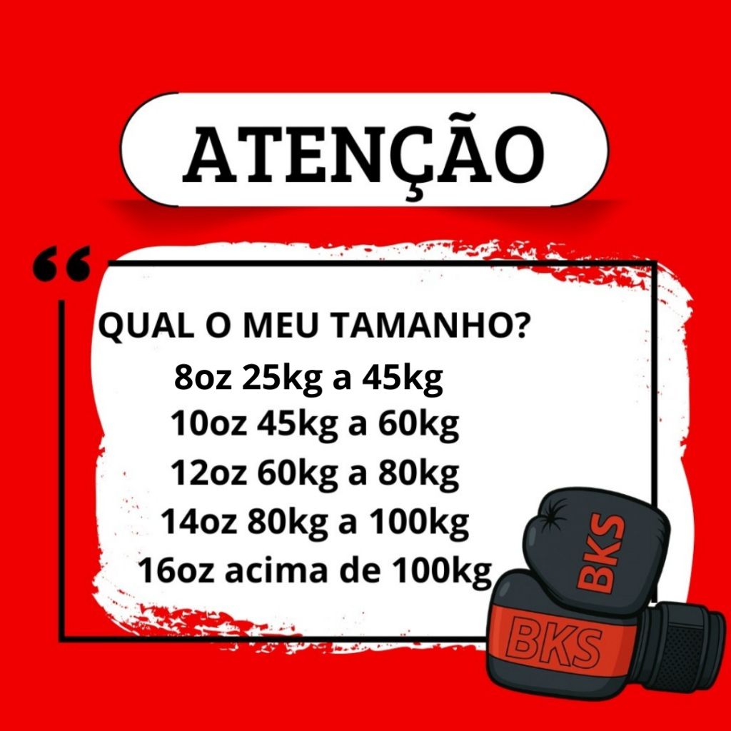 O kit da BKS contém: Um (01) Par de Luva de Boxing, Confeccionada em material sintético de alta resistência, com telinha spacer na palma e atadura, o spacer na palma com seu designer moderno faz com que a luva tenha uma ventilação evitando parte do suor, tamanhos ideias para usar com bandagem elástica, a costura da palma possui 2 agulhas fortalecendo e dando mais firmeza na luva, na parte superior temos preenchimento para que seus dedos fiquem no local certo aumentando ainda mais a pegada. Um (01) Par de Bandagem Elástica de aproximadamente 3 Mt, nossas bandagens fabricadas em 2 composições, deixando ela elástica e firme. Um (01) Bucal, após adquirir o kit BKS mergulhar o bucal em água fervendo por no máximo 3 segundos, com a mão higienizada aperte o bucal aos dentes para molda-lo. Um (01) Case pra guardar o bucal e deixar longe de bactérias. Tamanhos recomendados de acordo com o peso corporal: 8oz: 25 kg a 45kg 10oz: 45 kg a 60 kg 12oz: 60 kg a 80 kg 14oz: 80 kg a 100 kg 16oz: Acima de 100 kg Tem alguma dúvida? Nossa equipe está pronta para te ajudar pelo chat. SOBRE A LOJA: A K.O.X Unlimited, localizada em Cruzeiro do Oeste – PR, oferece artigos esportivos de qualidade, desempenho e estilo. Nosso objetivo é apoiar atletas e apaixonados por esporte com produtos confiáveis e atendimento diferenciado. Na K.O.X Unlimited, você encontra o que precisa para viver o esporte ao máximo! Sua compra é 100% segura: - Produto 100% Nacional. - Garantia de Fábrica contra defeitos de fabricação. - Acompanha Nota Fiscal.