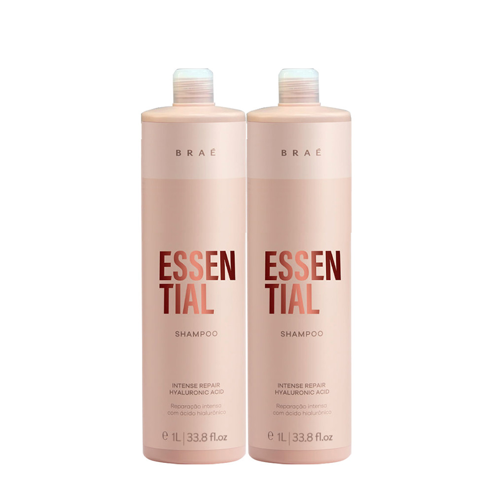 Kit Braé Essential - Shampoo 1Litro (2 unidades) Repara os fios danificados, promove hidratação progressiva e protege o cabelo contra agressões diárias e térmicas. Com ácido hialurônico, aminoácidos e complexo de óleos, os cabelos ficam mais fortalecidos. Indicado para todos os tipos de cabelos. Conselho de Aplicação Aplique no cabelo molhado, massageando suavemente sem esfregar os fios. Enxague.
