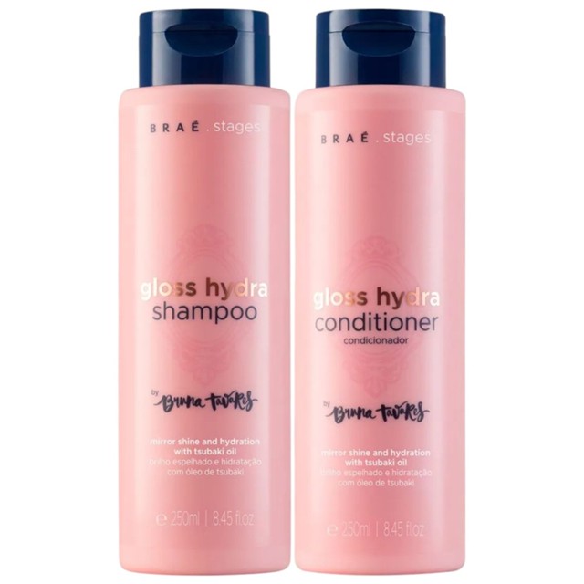 Kit Contém: 01 Braé Stages Gloss Hydra By Bruna Tavares Shampoo 250ml 01 Braé Stages Gloss Hydra By Bruna Tavares Condicionador 250ml O duo perfeito para o cuidado diário! O Shampoo e o Condicionador Gloss Hydra limpam suavemente e devolvem a hidratação ideal aos fios. Sua fórmula enriquecida com Óleo de Tsubaki e BT Bio Shine garante brilho espelhado, toque macio e cutículas alinhadas, sem pesar os cabelos. Aplique o Shampoo nos cabelos molhados, massageando o couro cabeludo. Enxágue e repita se necessário. Em seguida, distribua o Condicionador nos fios úmidos, deixe agir por alguns minutos e enxágue completamente. Óleo de Tsubaki: hidratação e suavidade com toque sedoso.BT Bio Shine: brilho intenso e controle do frizz.
