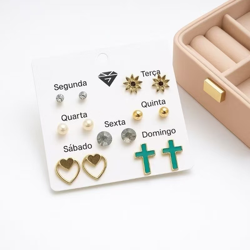 ✨ Kit 7 Pares de Brincos Femininos – Modelo Semaninha ✨ Diversos estilos disponíveis, estilos aleatórios oferecidos. Garanta praticidade e estilo todos os dias da semana com esse lindo kit de 7 pares de brincos. O modelo Semaninha foi criado para que você tenha uma opção diferente para cada dia, variando entre peças delicadas, modernas e cheias de charme. 🔹 Características do produto: Kit com 7 pares de brincos (1 para cada dia da semana) Disponível em Dourado Acabamento brilhante e elegante Modelos variados: Flor, pérola, Ponto de luz, entre outros Tamanho pequeno a médio (ideal para uso diário) Leves e confortáveis de usar 🔹 Benefícios: ✔ 7 opções em um só kit – ótimo custo-benefício ✔ Versátil: combina com looks casuais, de trabalho ou ocasiões especiais ✔ Delicados e modernos – perfeitos para qualquer estilo ✔ Excelente opção de presente criativo e útil ✔ Tendência em acessórios femininos 🔹 Sugestões de uso: Use um par por dia, acompanhando a proposta “Semaninha” Misture os modelos em segundo ou terceiro furo para um visual estiloso Combine com colares e pulseiras para realçar ainda mais o look 💖 Com o Kit Semaninha, você nunca mais vai se preocupar com qual brinco usar – já tem um para cada dia!