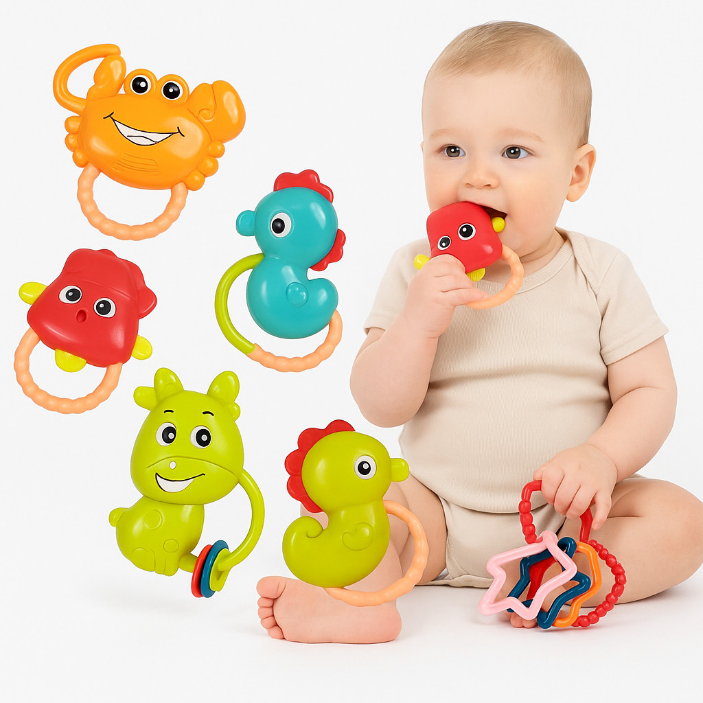Kit de Brinquedos para Bebê – 6 Peças Interativas Transforme o momento da brincadeira em aprendizado e diversão! Este kit completo vem com 6 brinquedos diferentes (chocalhos, animais e instrumentos), todos coloridos e sonoros, perfeitos para estimular o desenvolvimento dos pequenos. Além disso, cada peça possui áreas sensíveis para o bebê morder com segurança, ajudando na fase de dentição. Um brinquedo completo que une diversão, coordenação motora e estímulos sensoriais. Principais Benefícios Estimula a coordenação motora e os sentidos do bebê. Design colorido e divertido, que desperta a curiosidade. Peças com sons e barulhinhos para prender a atenção. Possui parte macia para o bebê morder com segurança. Ajuda no desenvolvimento sensorial e cognitivo. Especificações Técnicas Tipo: Kit de brinquedos infantis Quantidade: 6 peças (chocalhos, animais e instrumentos) Material: Plástico resistente e seguro para bebês Idade Recomendada: A partir de 3 meses Funções: Barulhos, cores vibrantes e mordedor Conteúdo da Embalagem 6x Brinquedos para Bebê (modelos variados com chocalhos, animais e instrumentos).