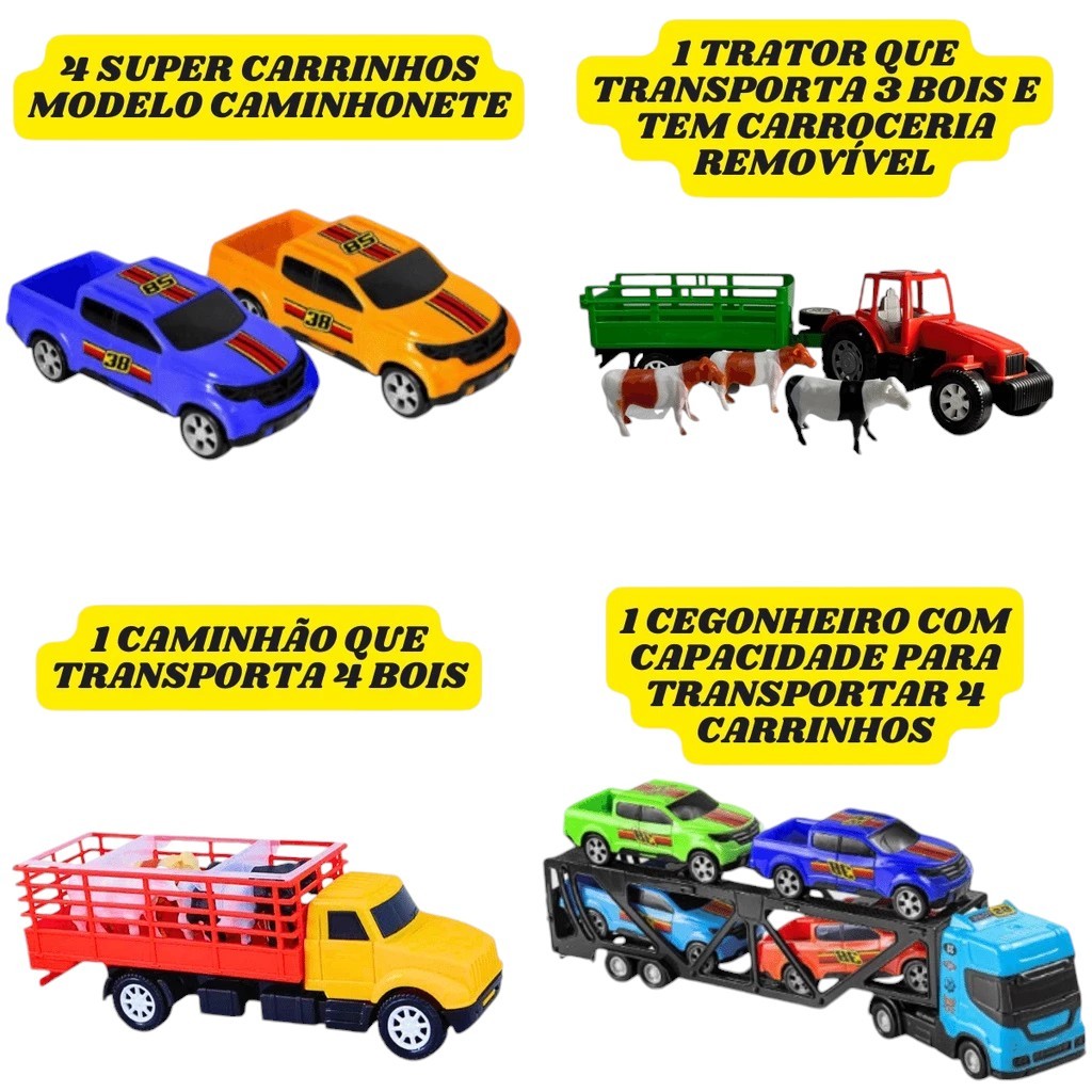 Kit Brinquedo Caminhão Cegonha Com 4 Carros Pickups + Trator Com 3 Bois Animais + Caminhão Mini Boiadeiro com 4 Bois
