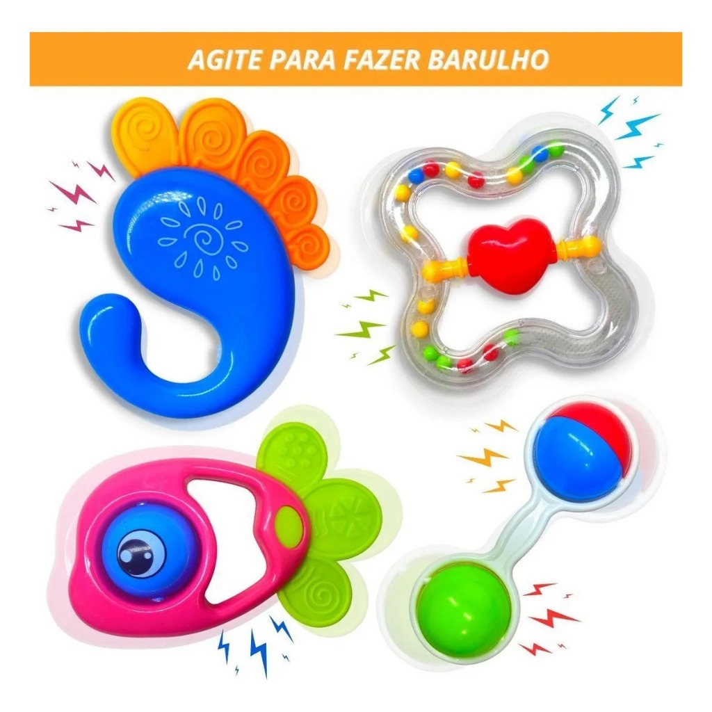 Kit Brinquedos Para Bebê com 4 Peças Nene Criança Chocalho + Mordedor Macio Colorido Infantil