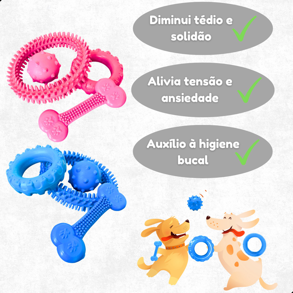 PERGUNTAS FREQUENTES OS MORDEDORES SÃO INDICADOS PARA FILHOTES? Os mordedores não são indicados para filhotes que não tenham feito a troca completa dos dentes. Uma vez que eles já tenham trocado completamente os dentes, é indicado, pois auxília no fortalecimento e desenvolvimento da dentição. OS MORDEDORES PREJUDICAM A DENTIÇÃO DO CACHORRO? Não! Os mordedores tem efeito ao contrário: colabora com o desenvolvimento e fortalecimento dos dentes do cachorro! Estimule o desenvolvimento e fortalecimento dos dentes do seu cão enquanto ele se diverte! Todo dono de cão sabe que os nossos amigos adoram brincar! Independente da idade, raça ou porte, os peludinhos de quatro patas adoram se divertir com o que veem pela frente! Diante disso, você sabia que brinquedos feitos especialmente para cães trazem uma série de benefícios? Um bom mordedor estimula a higiene bucal e o fortalecimento da dentição do cão, enquanto proporciona diversão e entretenimento aos nossos amigos! É desta forma que os mordedores são famosos entre os cães! O Ossinho Mordedor, Bolinha, Anêmona e Pneu para Cães ajudam no desenvolvimento e fortalecimento dos dentes dos cães, ao mesmo tempo que auxiliam na higiene bucal do animal! Agora você já entendeu o porquê dos mordedores serem um sucesso entre os peludinhos de quatro patas, né? Confira a série de benefícios que os pneus trazem aos nossos amigos! BENEFÍCIOS DO PNEU DE BORRACHA RESISTENTE , BOLA CRAVO, OSSINHO MASSAGEADOR E ANÊMONA: Auxílio à higiene bucal Elimina placas de tártaro Desenvolvimento dos dentes Fortalecimento da dentição Alivia stresse e ansiedade Diminui o comportamento destrutivo INFORMAÇÕES TÉCNICAS: Produto: Kit Brinquedos Pneu de Borracha Resistente P para Cães, Ossinho Massageador Azul P, Bola Cravo Maciça, Anêmona Marca: Petliz Tipo: Brinquedos Animal: Cachorros Porte: Pequeno Raça Específica: Não Sexo Específico: Não Itens Inclusos: 1x Brinquedo Pneu de Borracha Resistente para Cães P 7 cm + 1x Ossinho Massageador P 10 cm + 1x Bola Cravo Maciça 40 mm + 1x Brinquedo Anêmona Azul 11 cm Material: Borracha Medidas Aproximadas: Pneu: 7 cm; Ossinho: 10 x 3,5 cm; Bola: 40 mm (4 cm); Anêmona: 11 cm Cores: Azul ou Rosa OBSERVAÇÃO: Enfatizamos que nenhum brinquedo é 100% indestrutível. Acompanhe o seu pet e tome cuidado para que, caso ele destrua o brinquedo, ele não venha a engulir nenhuma parte.