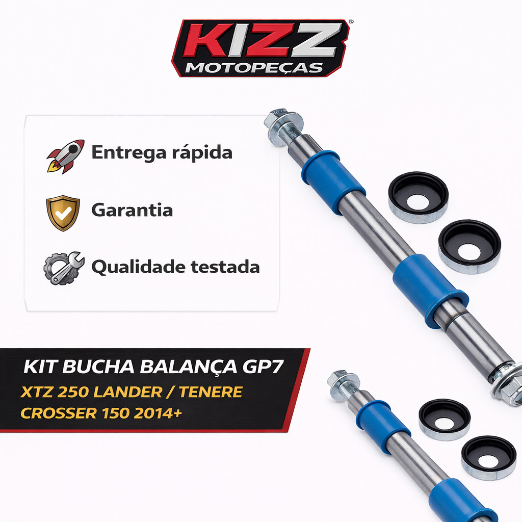 Bucha Balança Traseira GP7 – XTZ 250 Lander / XTZ 250 Ténéré / XTZ 150 Crosser Sua moto está com folga na traseira, estalos na suspensão ou sensação de instabilidade nas curvas?A Bucha de Balança Traseira GP7 é a solução ideal para restaurar o alinhamento da suspensão, eliminando folgas e garantindo pilotagem firme, segura e precisa. Quando as buchas da balança se desgastam, a moto perde estabilidade e começa a gerar ruídos ou vibrações. Este kit GP7 foi desenvolvido para reposição direta, mantendo o funcionamento correto do conjunto traseiro da moto. Autoridade do Produto Fabricado pela GP7, marca reconhecida no mercado de motopeças, o kit oferece alta resistência mecânica, excelente durabilidade e encaixe padrão original, permitindo instalação sem adaptações. Produto ideal para manutenção preventiva ou corretiva da suspensão traseira. MODELOS COMPATÍVEIS Yamaha XTZ 250 Lander 2007 em diante Yamaha XTZ 250 Ténéré 2011 a 2018 Yamaha XTZ 150 Crosser 2014 em diante ATENÇÃO:Compatível exclusivamente com os modelos listados acima. Não compatível com outras motos ou versões não informadas. CARACTERÍSTICAS TÉCNICAS Marca: GP7Aplicação: Balança traseiraSistema: Suspensão traseiraMaterial: Metal de alta resistênciaEncaixe: Padrão originalNecessita adaptação: Não BENEFÍCIOS Elimina folgas na balança traseira Melhora estabilidade e controle da moto Reduz ruídos e vibrações da suspensão Maior durabilidade do conjunto traseiro Instalação simples e rápida CONTEÚDO DA EMBALAGEM 01 Kit Bucha Balança Traseira GP7 POR QUE COMPRAR NA KIZZ MOTO PEÇAS? Produto com procedência garantida Envio rápido e embalagem segura Atendimento especializado em motopeças Compra segura nos marketplaces Imagens meramente ilustrativas.