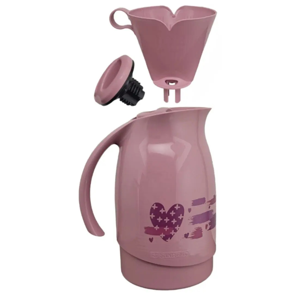 O Kit Bule Térmico Plástico Rosa 700ml e Suporte para Filtro de Café 102 Rosa Termic Sanremo é o conjunto ideal para aquele cafezinho. O bule possui tampa rosca, o que permite que não pingue, e alça ergonômica, que facilita o manuseio. Também conta