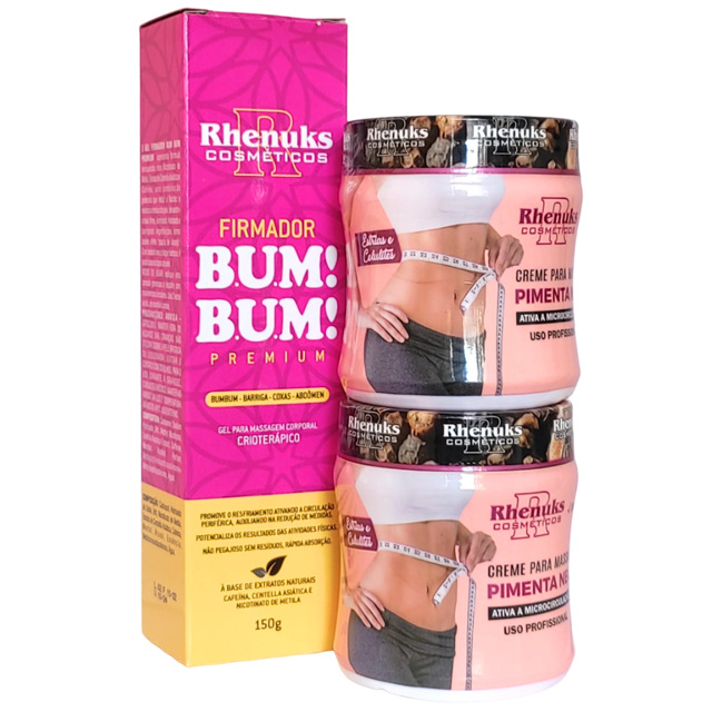 2 Unidades Pimenta Negra 200g Ajuda a eliminar estrias, celulite, deixando uma sensação de maciez. Reduz medidas e queima gordura localizada . Sua fórmula exclusiva, proporcionando uma sensação de prazer calmante e refrescante. É projetado para ajudar a reduzir as medidas, ativando a microcirculação, que também é usada para estrias e celulite. Uso profissional. Testado dermatologicamente. Modo de uso - Aplicar no local desejado e massageando suavemente até a completa absorção. ____________________________ 1 Unidade Gel Massageador Firmador de Bumbum, Barriga, Coxa e Abdômen 150g Gel Firmador BumBum Premium apresenta fórmula enriquecida com uma combinação poderosa que reduz a flacidez e melhora a textura da pele, deixando-a mais firme, iluminada, hidratada e corrigindo imperfeições como aquele efeito ''casca de laranja''. Com textura leve e toque sedoso, é para todos os tipos de pele. *Ajuda a eliminar estrias e celulites Modo de usar: Aplique uma camada generosa e espalhe com movimentos circulares. Use 2 vezes ao dia, de manhã e à noite.