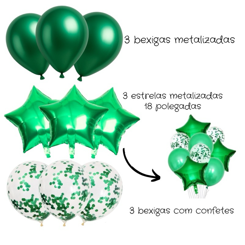 Chegou o kit buque! O kit perfeito e completo para qualquer ocasião, aniversários, comemorações, chá de bebê, natal e muito mais! O kit contém: 3 estrelas metalizadas 18 polegadas 3 bexigas cromadas 10 polegadas 3 bexigas latex transparente com confetes 10 polegadas. Selecione a cor desejada antes da compra Todos os kits são enviados da mesma cor, não fazemos alteração. *Envio imediato!