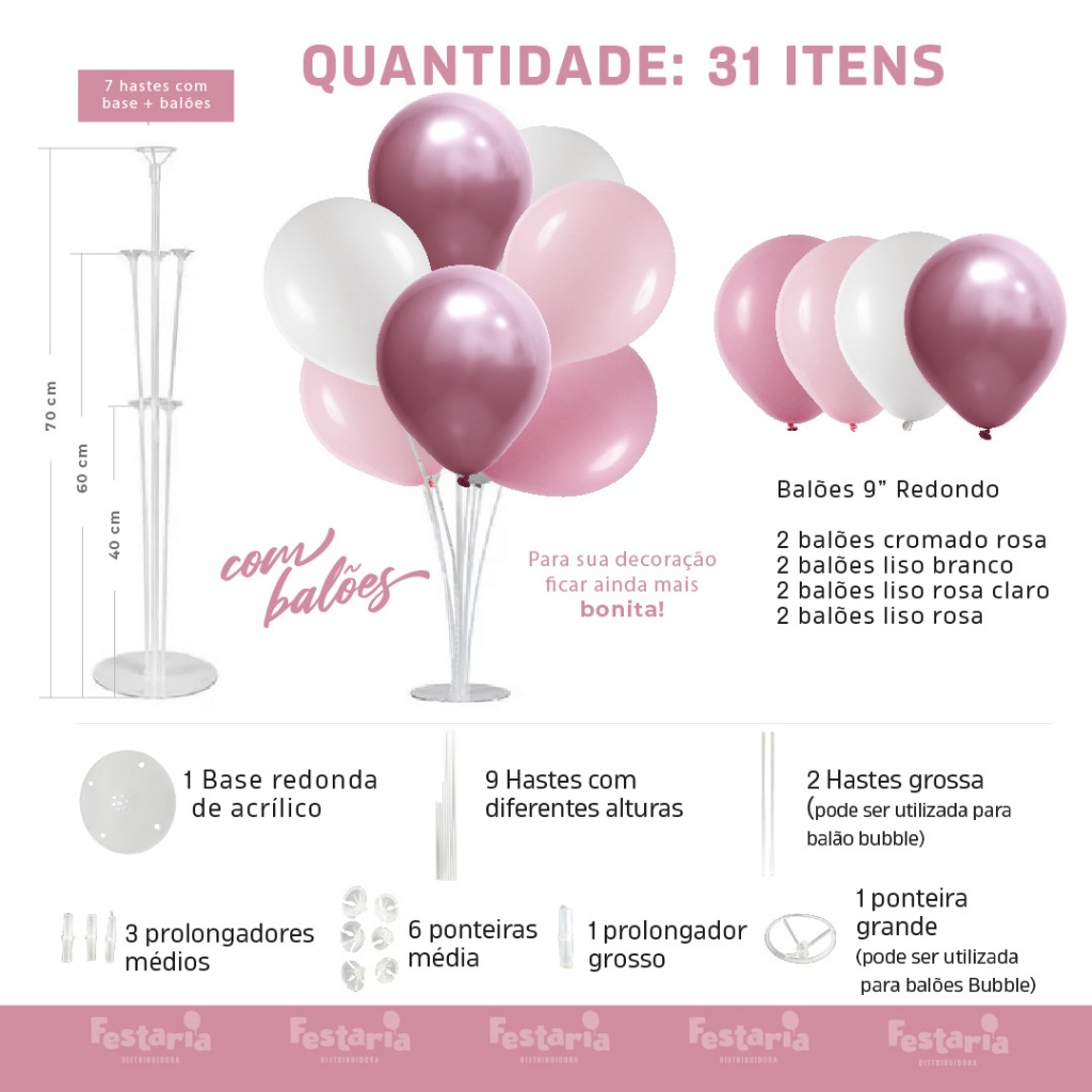 SUPORTE DE BALÃO REDONDO PROFISSIONAL COM 7 HASTES REGULÁVEIS E BASE Transforme qualquer evento em uma verdadeira celebração com o nosso Suporte de Balão Redondo Profissional! Ideal para decorações de festas, casamentos, aniversários, eventos corporativos e muito mais, este suporte foi desenvolvido para oferecer praticidade, elegância e estabilidade. Características do Produto: Design Profissional: Estrutura moderna e discreta, perfeita para destacar os balões em qualquer ambiente. 7 Hastes Reforçadas: Permitem a montagem de arranjos criativos e personalizados, com diferentes alturas e formatos. Base Resistente e Estável: Garante segurança e firmeza. Fácil Montagem: Encaixe rápido e intuitivo, sem necessidade de ferramentas. Reutilizável: Feito com materiais duráveis e de alta qualidade, ideal para uso contínuo em diversos eventos. Conteúdo da Embalagem: 1 Base plástica reforçada 7 hastes plásticas (com conectores, se necessário) Instruções de montagem Dê um toque profissional à sua decoração com praticidade e estilo!
