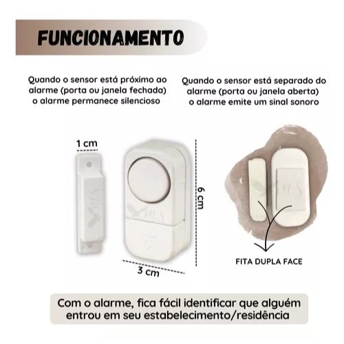 Alarmes sonoro sem fio com sensor magnético. Mantenha sua casa mais segura com este alarme que detecta a abertura de portas, portões e janelas por meio de um alarme que identifica a entrada de pessoas no local. O sensor é super prático de instalar pois não precisa ser pregado o que não danifica o local. O alarme contém fita dupla face resistente para fixa-lo no lugar desejado, além de obter botão liga/desliga para aciona-lo no momento que desejar para evitar incômodos. O produto já acompanha baterias LR44 - 1,5 V e não tem necessidade de usar fios. Características: - Alarme sonoro com sensor magnético - Acompanha fita dupla-face para fixação - Botão: Liga / Desliga - Utiliza 03 baterias ( inclusas ) Medidas: - Alarme: 6 x 3 cm - Sensor: 5 x 1 cm > Produto disponível a pronta entrega <