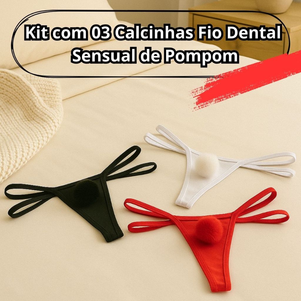 Kit c/03 Calcinhas Fio Dental Sensual de Pompom Sexy Luxo