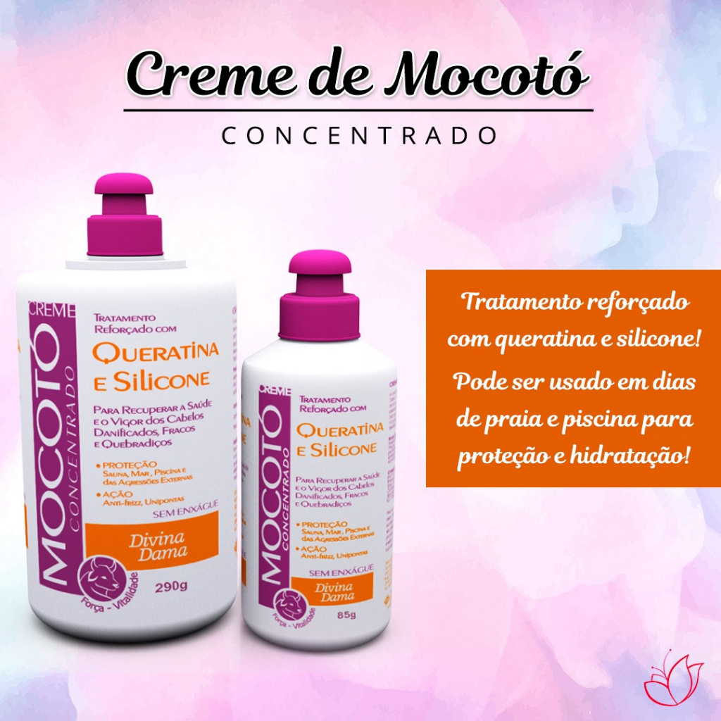 Somos o iSalão, Fazemos parte de um grupo com muitos anos no mercado de perfumaria. Garantimos a procedência de tudo que vendemos. Pode confiar Todos os nossos produtos são 100% originais. Estamos no mercado há mais de 26 anos. Este kit contém: 03 CREME DE MOCOTÓ 290 g cada A exclusiva fórmula do creme de Mocotó Divina Dama concentra o mocotó extraído do tutano bovino, enriquecido com o poder restaurador da queratina e o brilho e a proteção do silicone. Juntos, promovem um tratamento reforçado para recuperar a saúde, o vigor e o brilho dos cabelos danificados, fracos e quebradiços. MODO DE USAR: Após lavar os cabelos, seque-os levemente. Aplique uma quantidade do Creme Mocotó nos cabelos e faça seu penteado preferido. Não precisa enxaguar. Pode ser aplicado antes, durante e depois do banho de mar e piscina.Aplicação e Resultados. Composição: Cetearyl Alcohol, Ceteareth-20, Petrolatum, Paraffinum Liquidum, Cetrimonium Chloride, Glycerin, Phenoxyethanol, Methyparaben, Propylparaben, Ethylparaben, Butylparaben, Isobutylparaben, Lactic Acid, Bubulum Oil, Cyclopentasiloxane, Poliquarternium-10, Hydrolyzed Keratin, Parfum, Aqua.