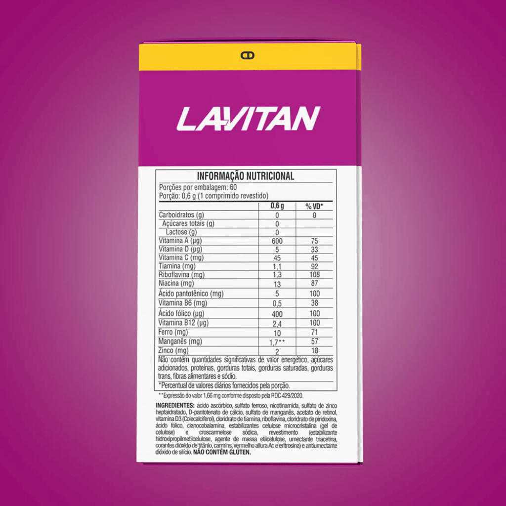 Lavitan A-Z Mulher Lavitan Mulher é um suplemento vitamínico-mineral rico em ácido fólico. Possui uma fórmula balanceada desenvolvida para a mulher. Não engorda. Zero calorias. Uso oral. Uso adulto. Este kit é composto pelos seguintes itens: :: 4 Unidade Lavitan A-z Mulher Cimed com 60 Comprimido Especificações Lavitan A-z Mulher Cimed com 60 Comprimido: :: Gênero: Feminino :: Indicação e Uso: Ingerir um comprimido por dia. :: Sabor: sem sabor :: Medidas: 24cm X 16cm X 10cm :: Quantidade: 60 drageas :: Garantia: Do Fabricante :: Fabricante: Cimed :: Tipo de Material: drageas :: Fragrância: inodóro :: Composição: Ácido ascórbico, sulfato ferroso, nicotinamida, sulfato de zinco, sulfato de manganês, d-pantotenato de cálcio, acetato de vitamina A, cloridrato de tiamina, riboflavina, cloridrato de piridoxina, ácido fólico, vitamina D3, cianocobalamina, antiumectante dióxido de silício, estabilizantes celulose microcristalina e croscarmelose sódica, revestimento (agente de corpo etilcelulose, estabilizante hidroxipropilmetilcelulose, umectante triacetina, corante inorgânico dióxido de titânio e corantes vermelho 40, vermelho eritrosina e carmim). SEM ADIÇÃO DE AÇÚCARES. NÃO CONTÉM GLÚTEN. :: Observação: Gestantes, nutrizes e crianças de até 3 (três) anos de idade, somente devem consumir este produto sob orientação de médico ou nutricionista. Consumir este produto conforme a recomendação de ingestão diária constante na embalagem. Mantenha o produto fora do alcance das crianças. :: Sobre as Imagens do Anuncio: As fotos dos produtos são meramente ilustrativas, pois o fornecedor pode alterar a embalagem sem aviso prévio :: Observações Alérgicas: Apenas para quem possuí alergia a algum de seus componentes, em caso de reações alérgicas interrompa o uso imediatamente :: Tamanho de Embalagem: 24cm x 16cm x 10cm