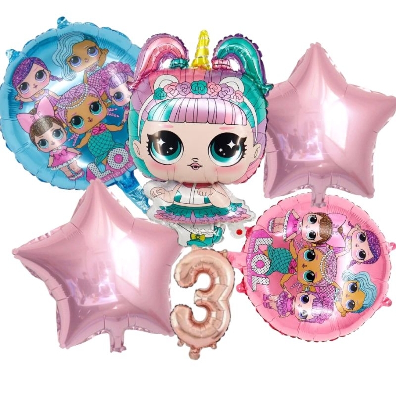 kit c/1/ 6 balões metalizado lol unicórnio corpo mede 50cm, redondo, estrela mede 45 cm, número mede 40 cm