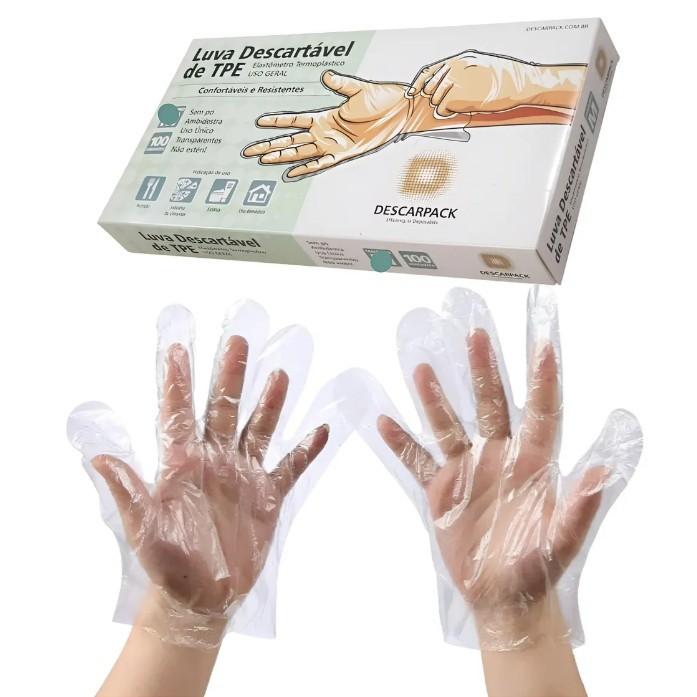 Marca: Descarpack Embalagem: 10 caixas C/100 unidades cada Tamanho: M Descrição: A Luva de TPE sem pó Descarpack é uma luva descartável fabricada em elastômero termoplástico, desenvolvida para a proteção das mãos do usuário como uma barreira física que proporciona segurança no uso e reduz os riscos de contaminações. * Isenta de pó na composição; * Ambidestra; * Confortáveis e resistentes; * Transparente; * Dispensado de CA por não ser considerado um EPI; * Não estéril, descartável e de uso único. A Luva de TPE Descartável sem Pó da Descarpack é indicada para utilização durante procedimentos estéticos, nutrição ou manipulação de alimentos em geral, para limpeza doméstica, etc. 1) A luva não deve ser utilizada na manipulação de agentes químicos ou ácidos, líquidos quentes e presença de fogo. Também não é indicada para procedimentos médicos; 2) Não lavar ou reutilizar luvas usadas; 3) Descartar o produto em local apropriado após o uso.